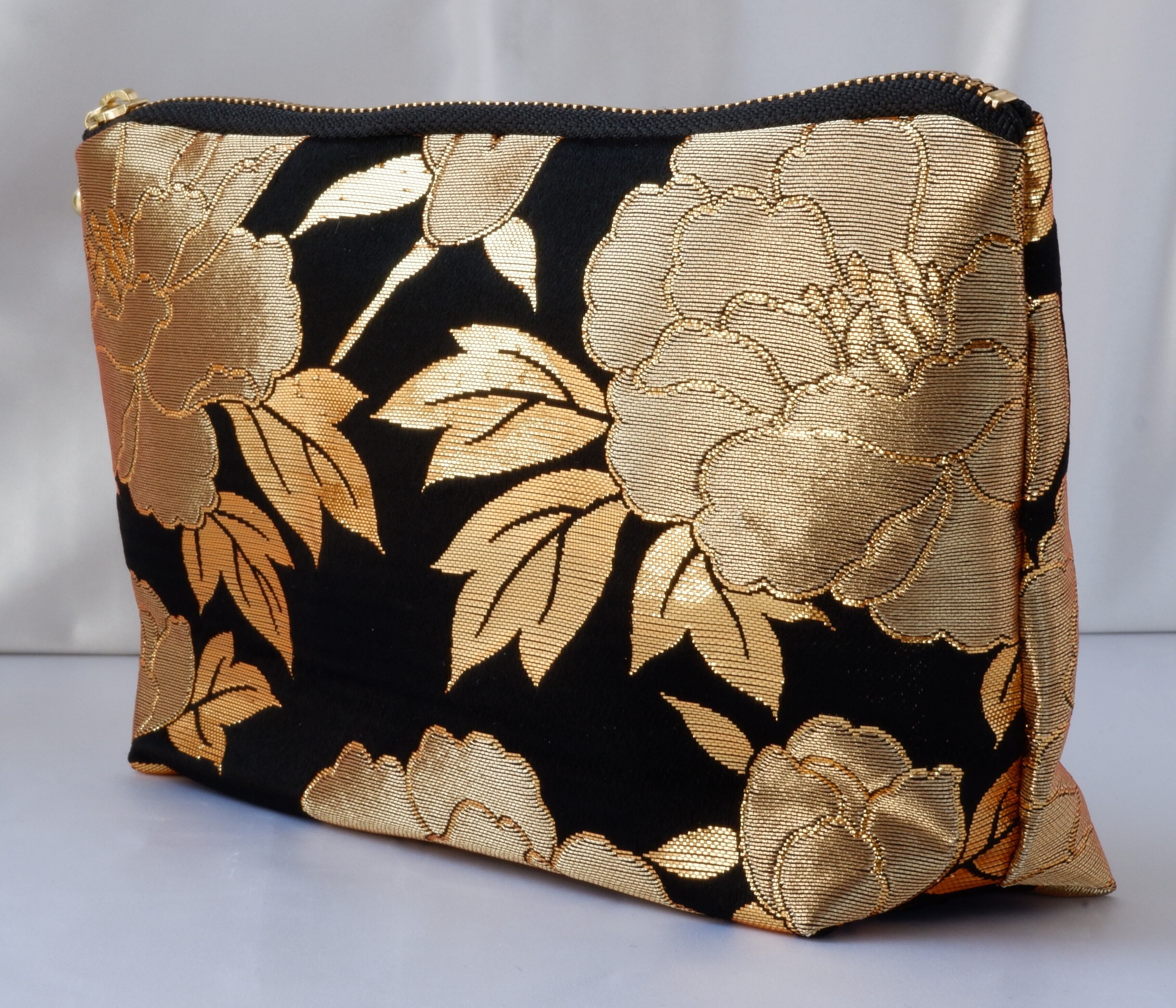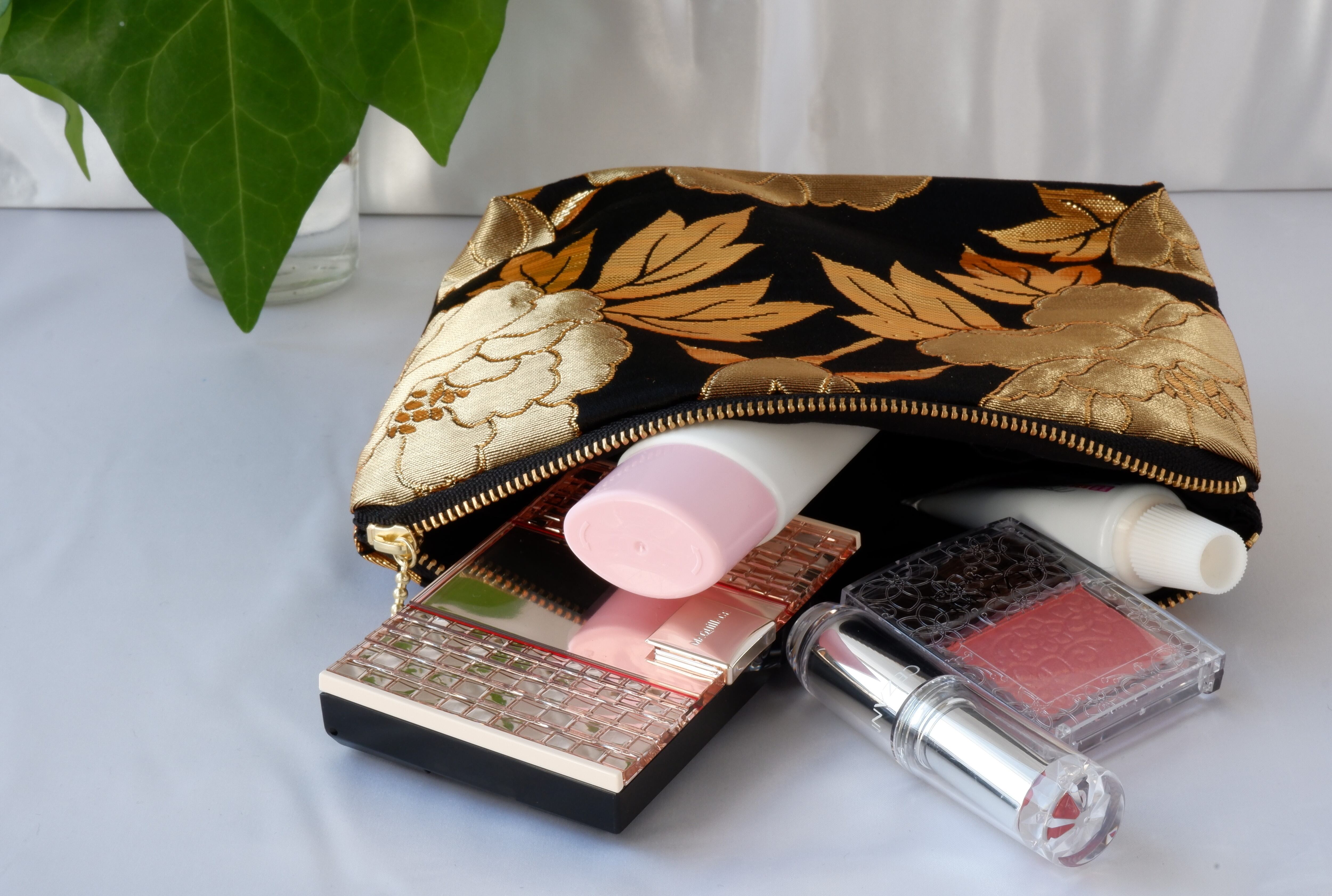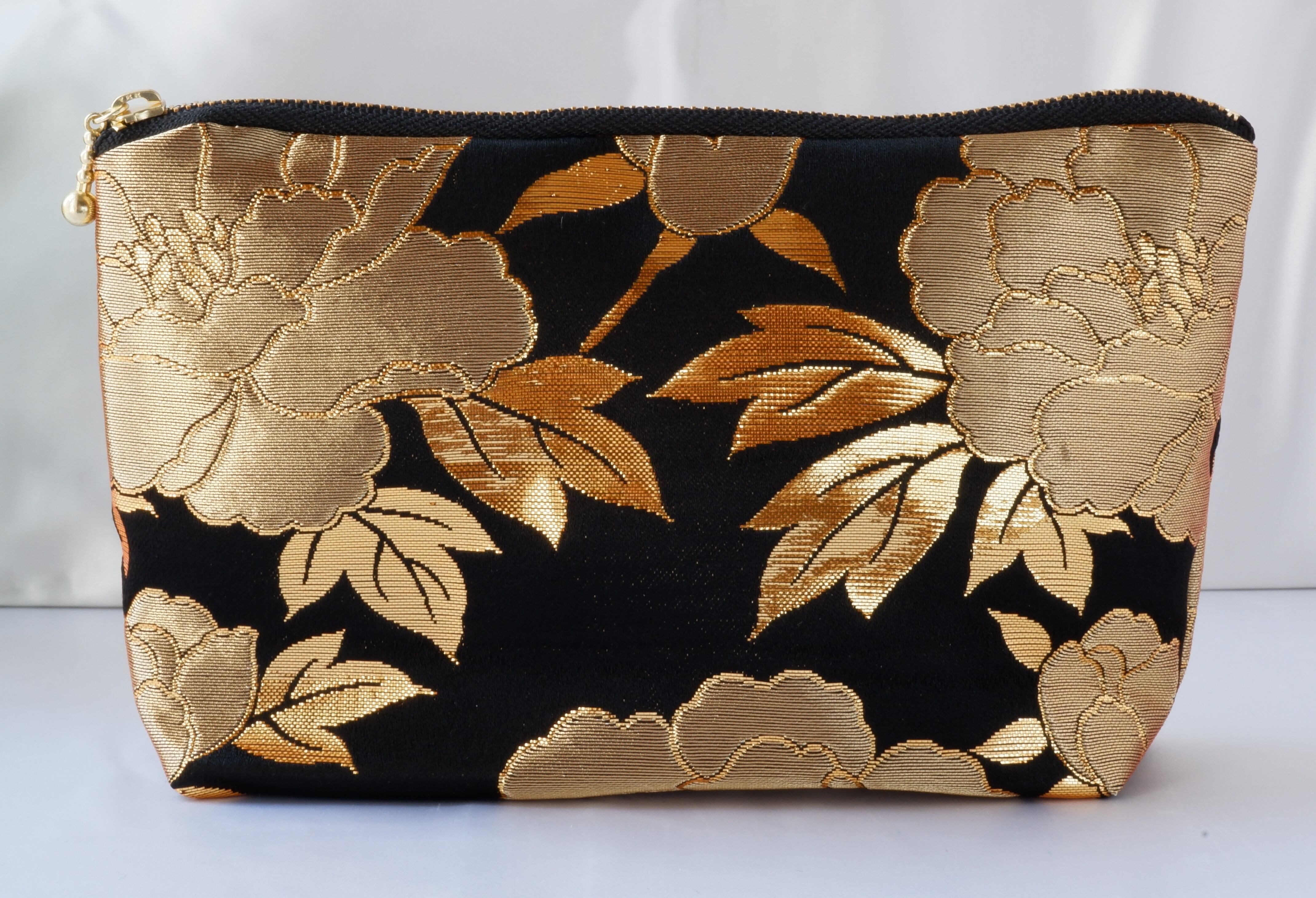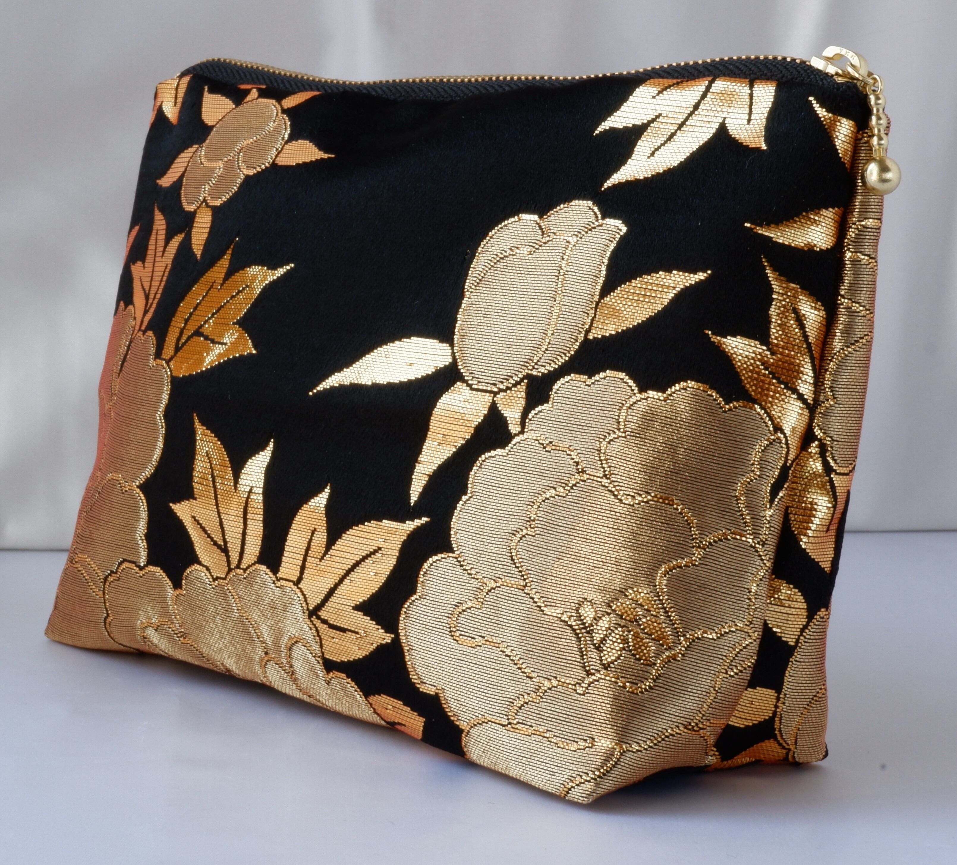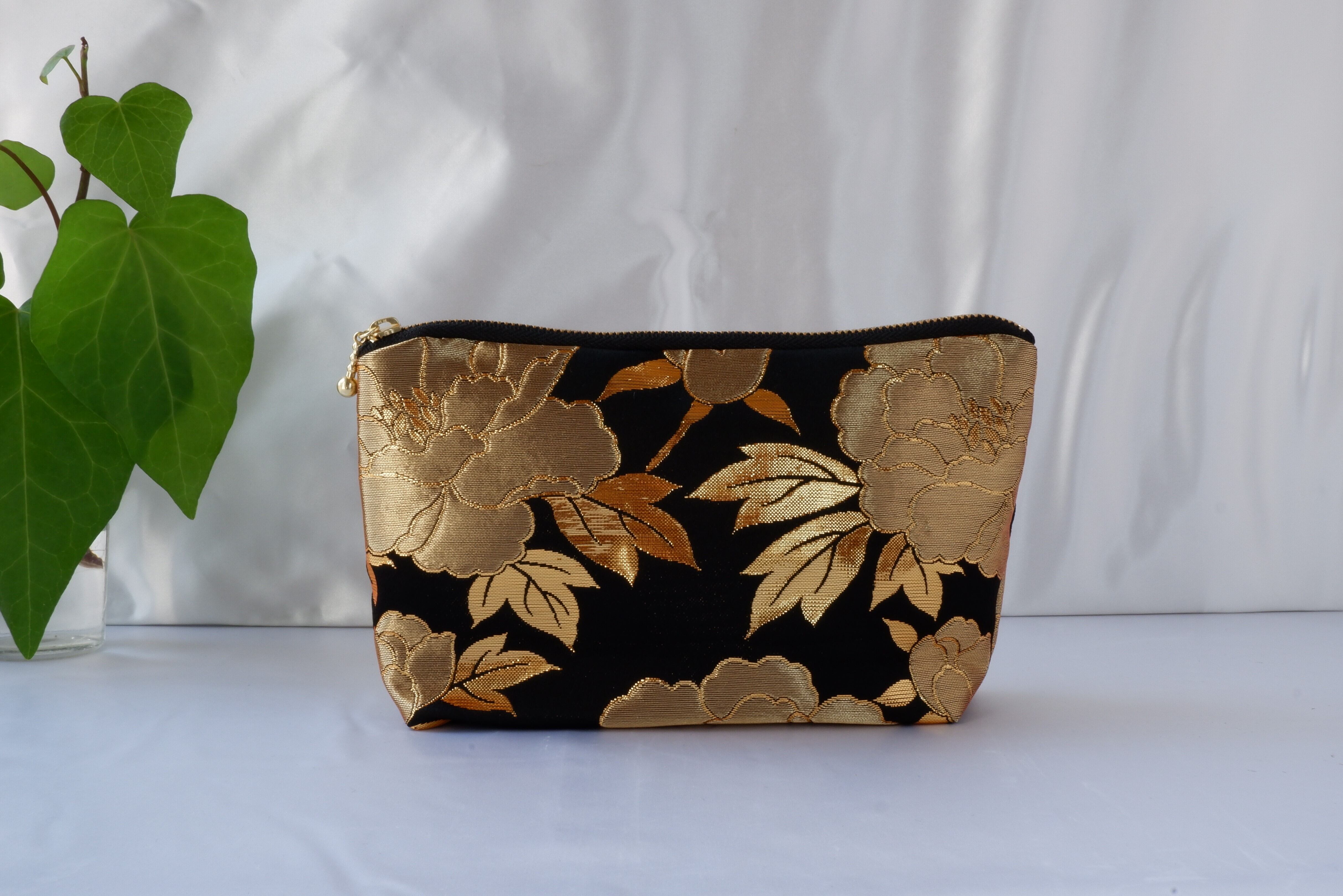 着物 ポーチ 黒 金 牡丹 絹 ポケット付き シルクの美しい光沢 着物リメイク 帯 アップサイクル