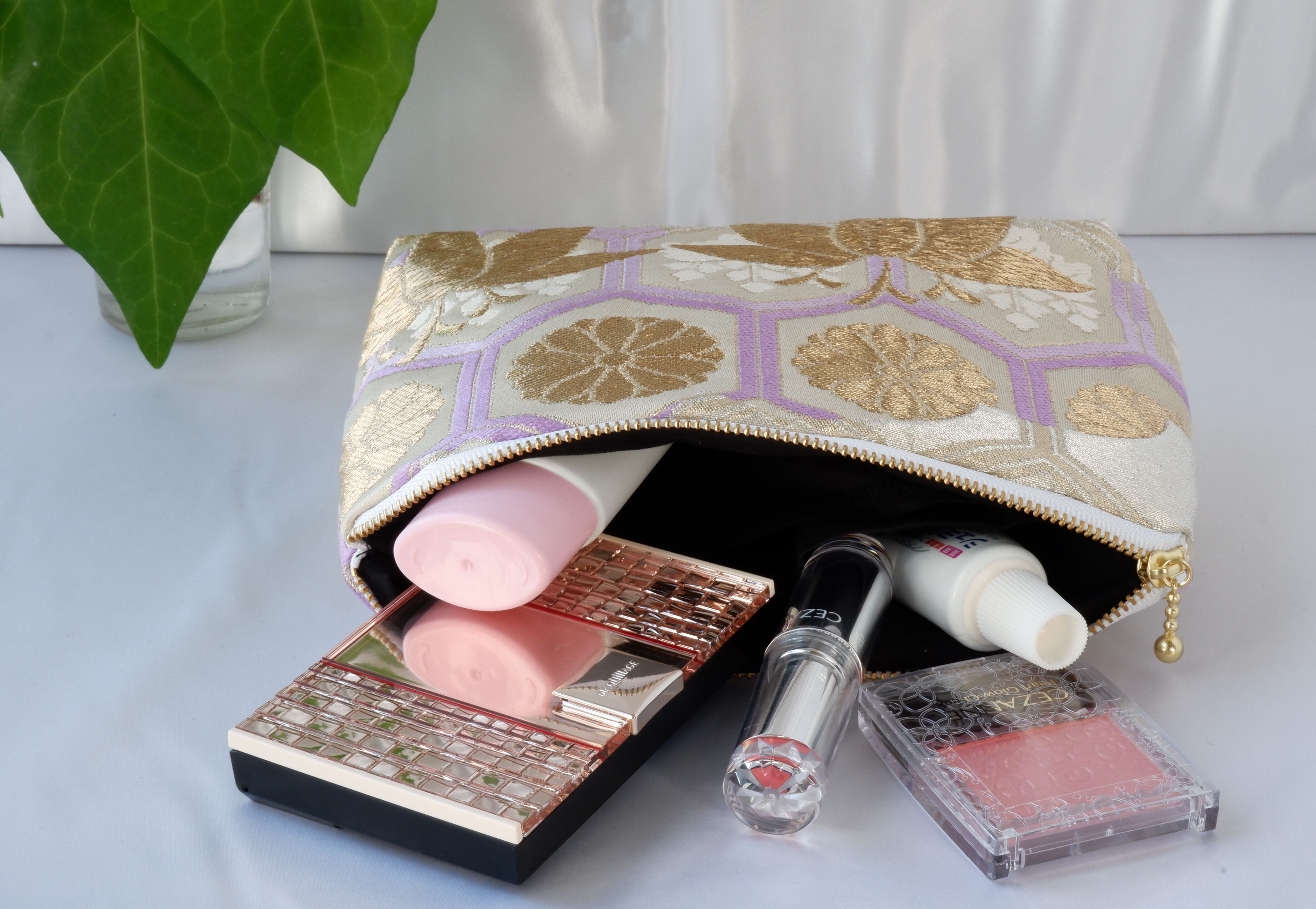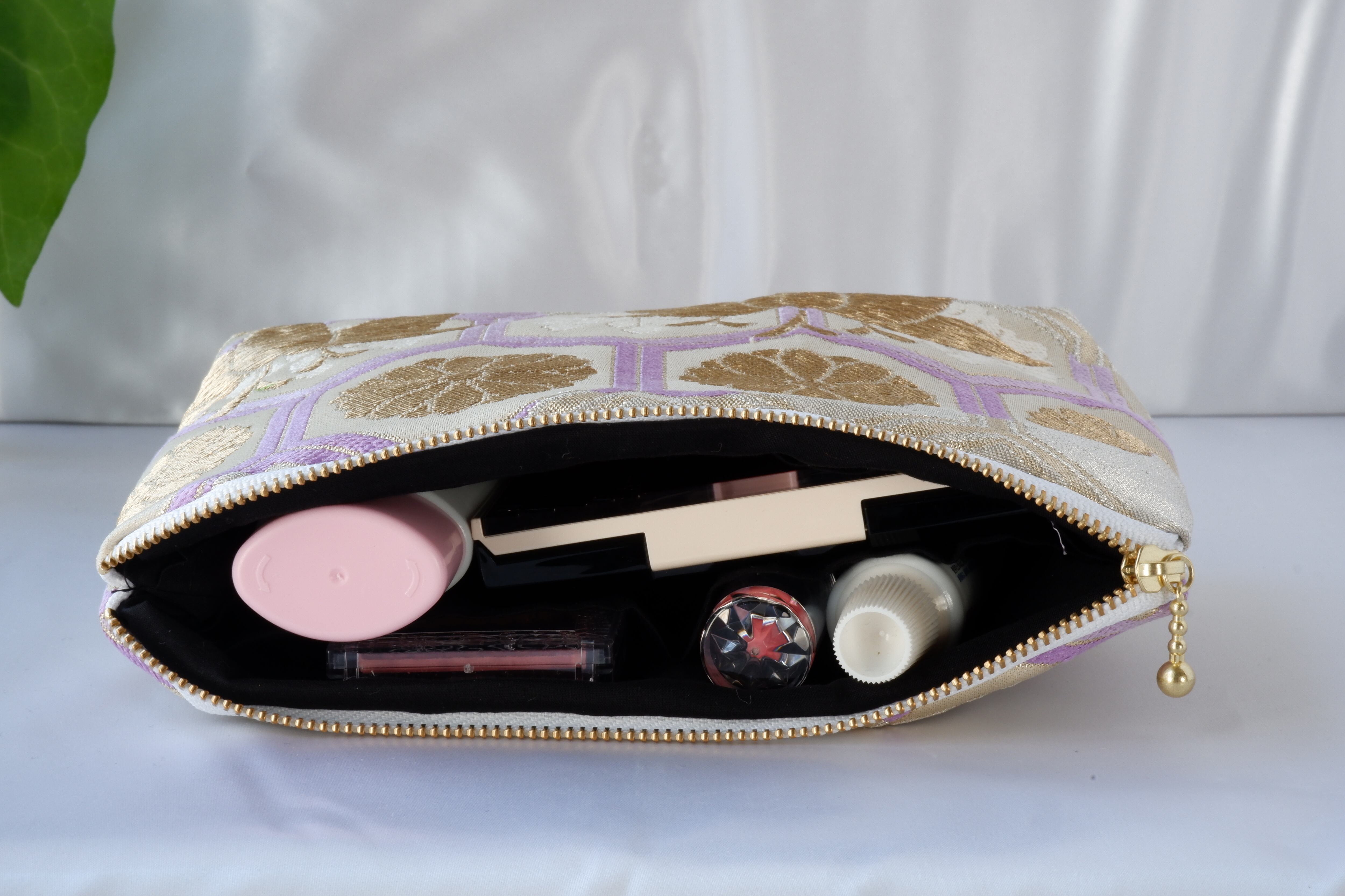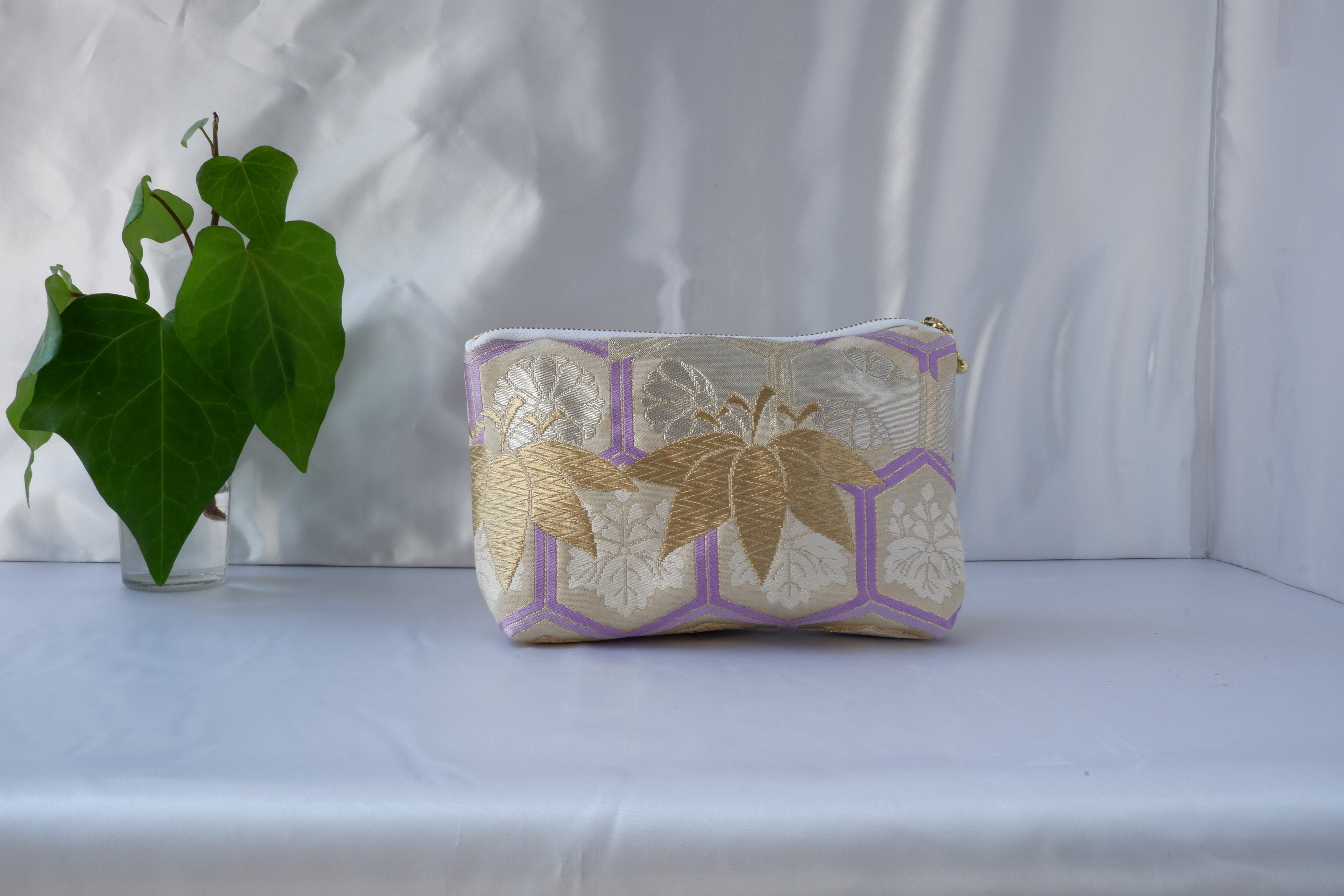 着物ポーチ 白 紫 笹 桐 菊 亀甲 ポケット付き シルクの美しい光沢 着物リメイク 帯 アップサイクル