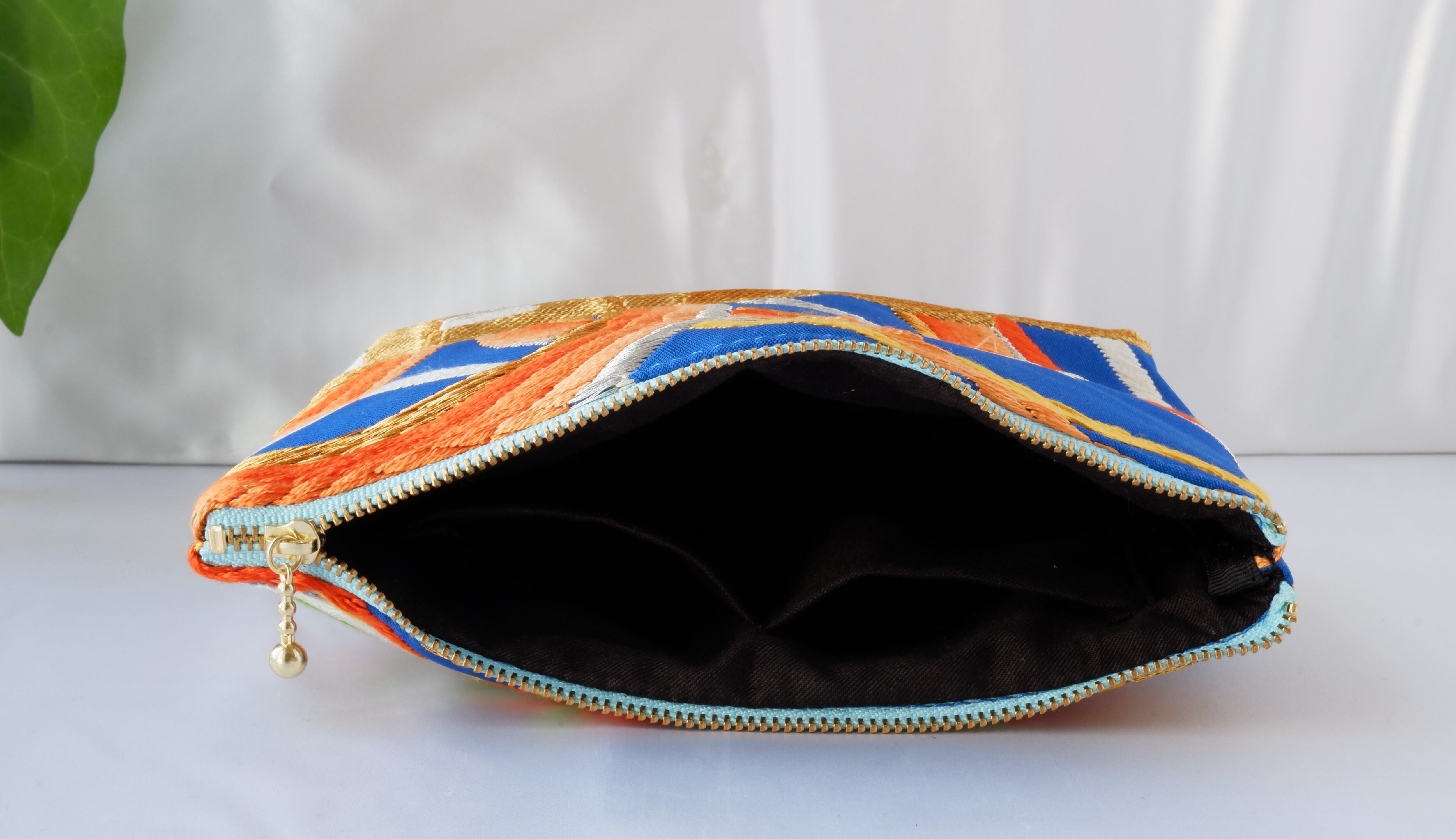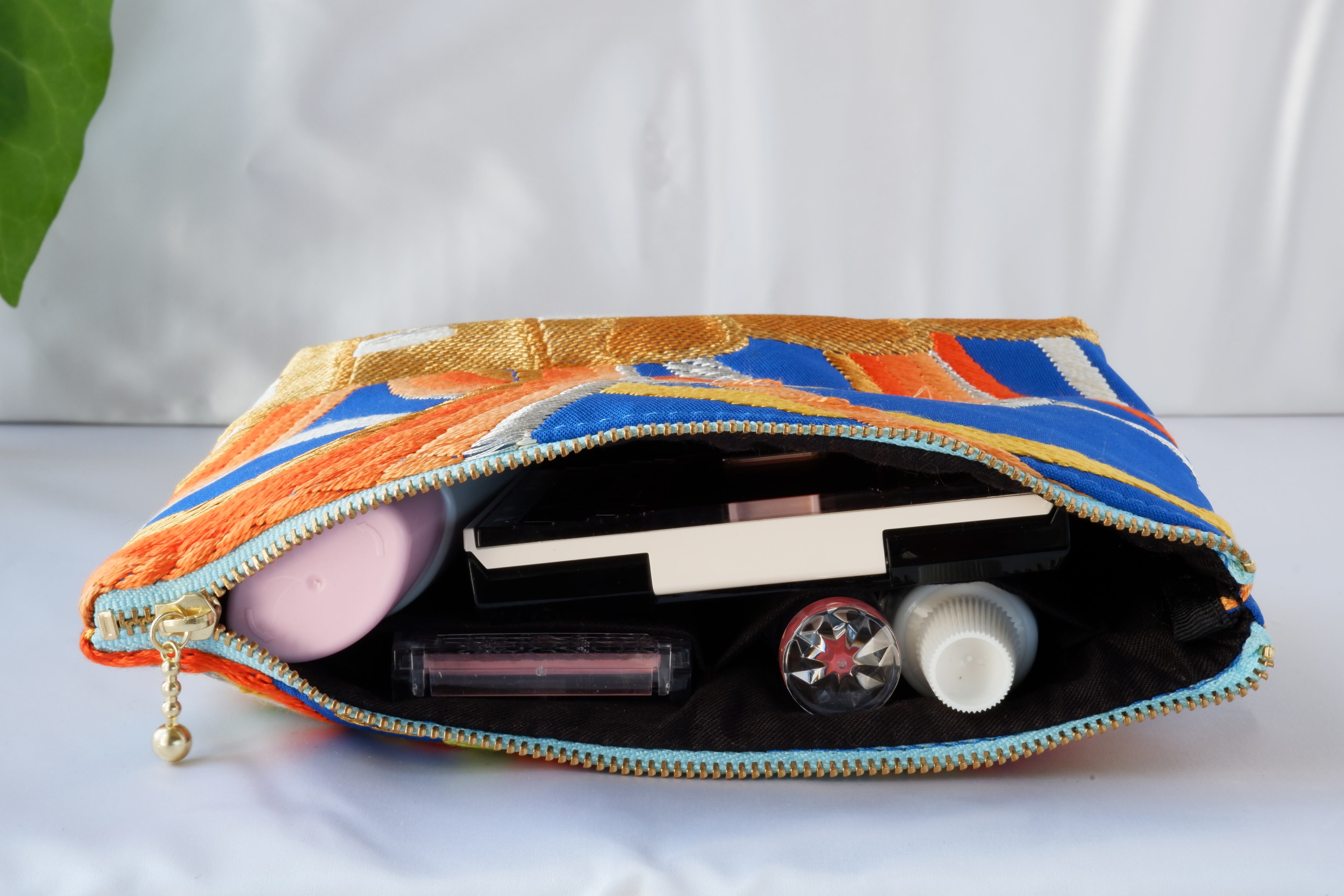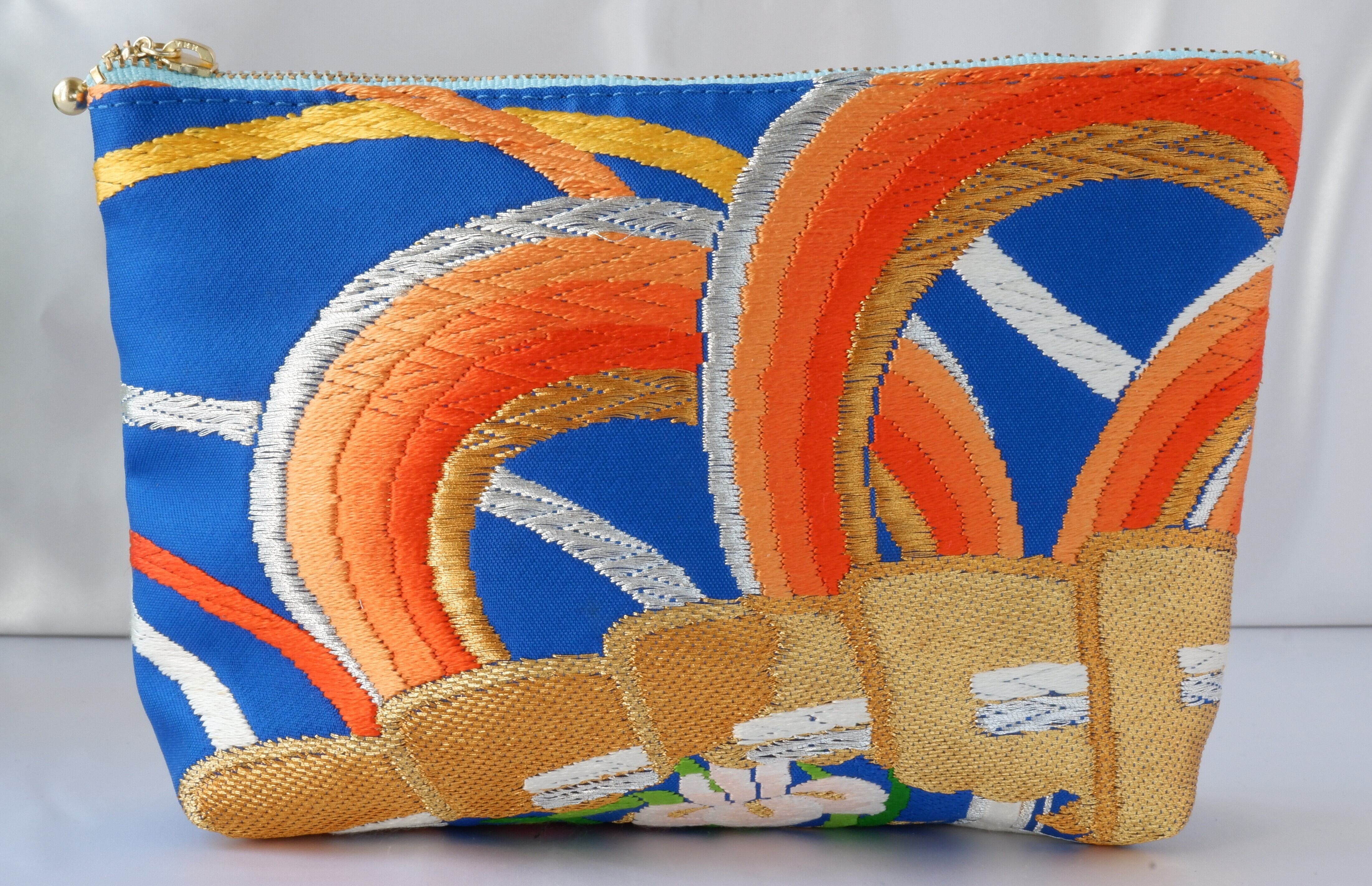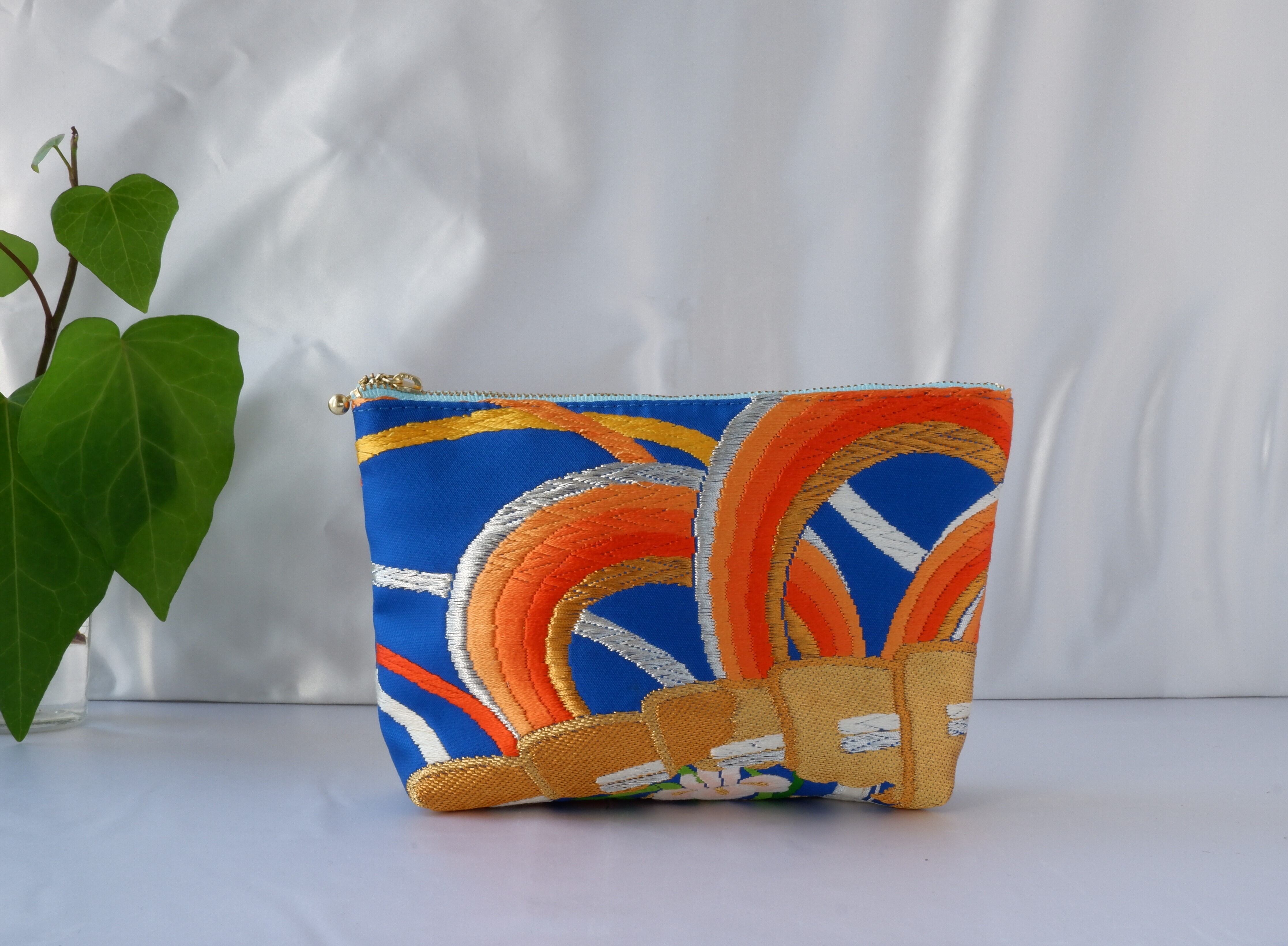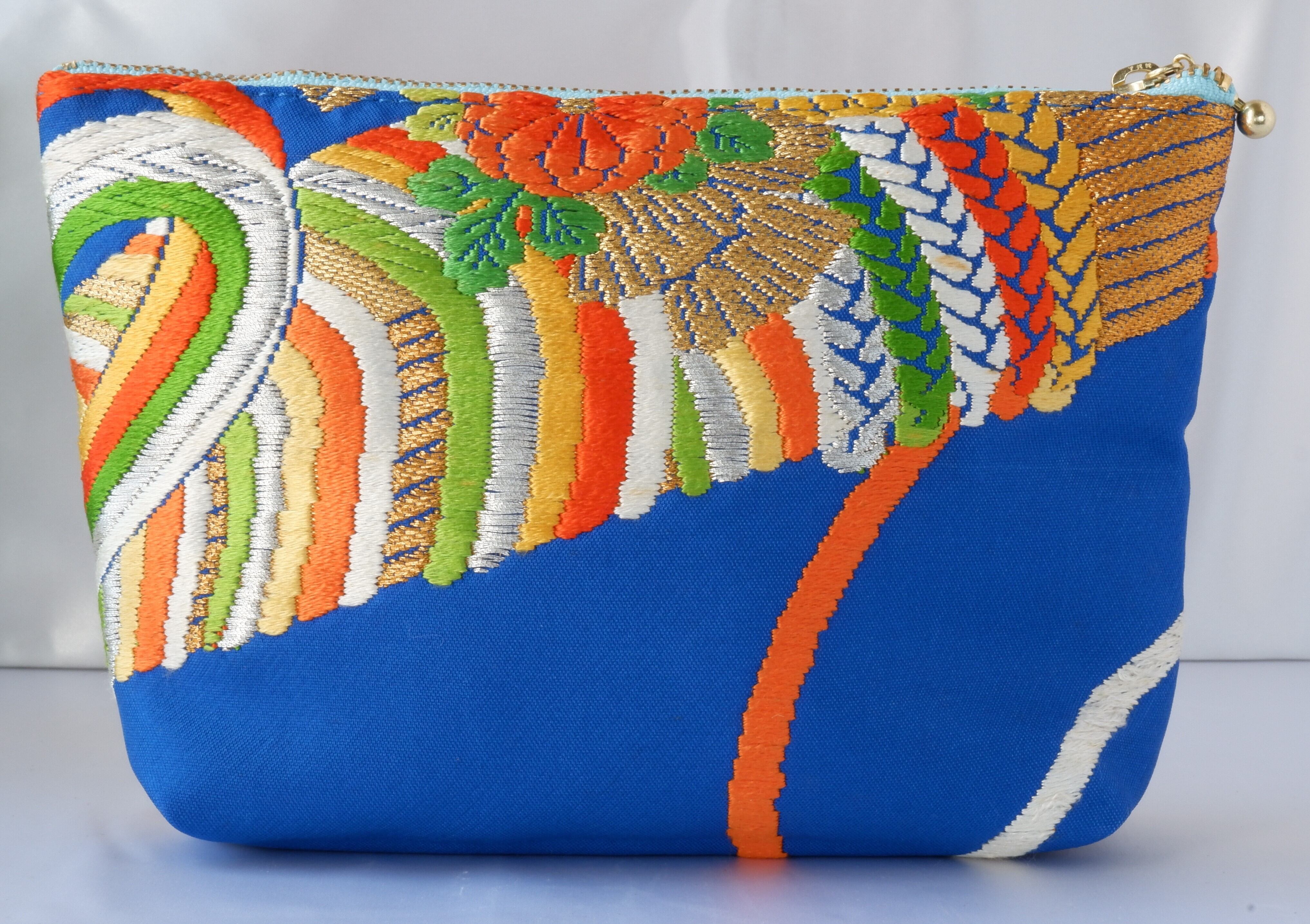 着物ポーチ 青 菊 組紐 絹 ポケット付き シルクの美しい光沢 着物リメイク 帯 アップサイクル