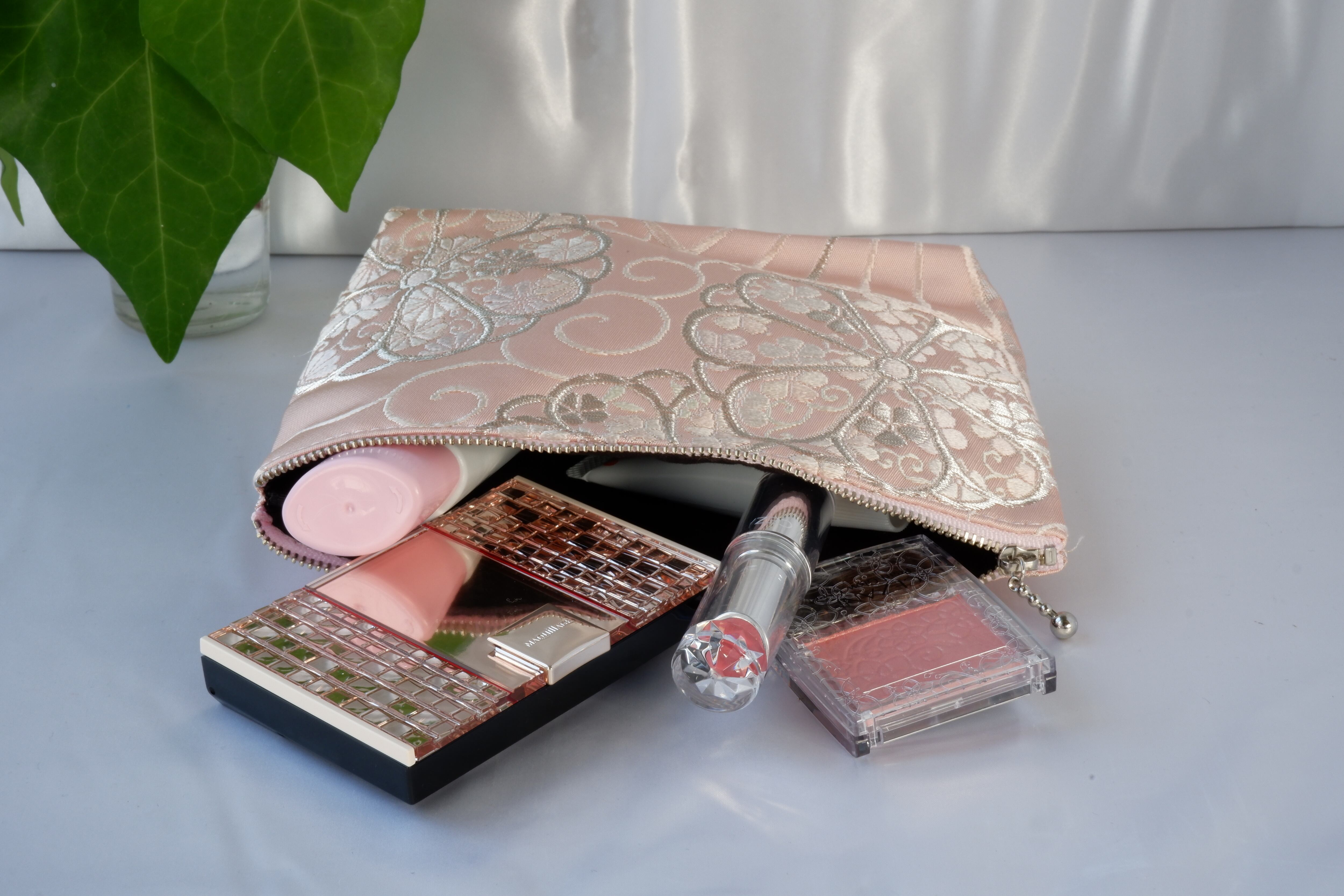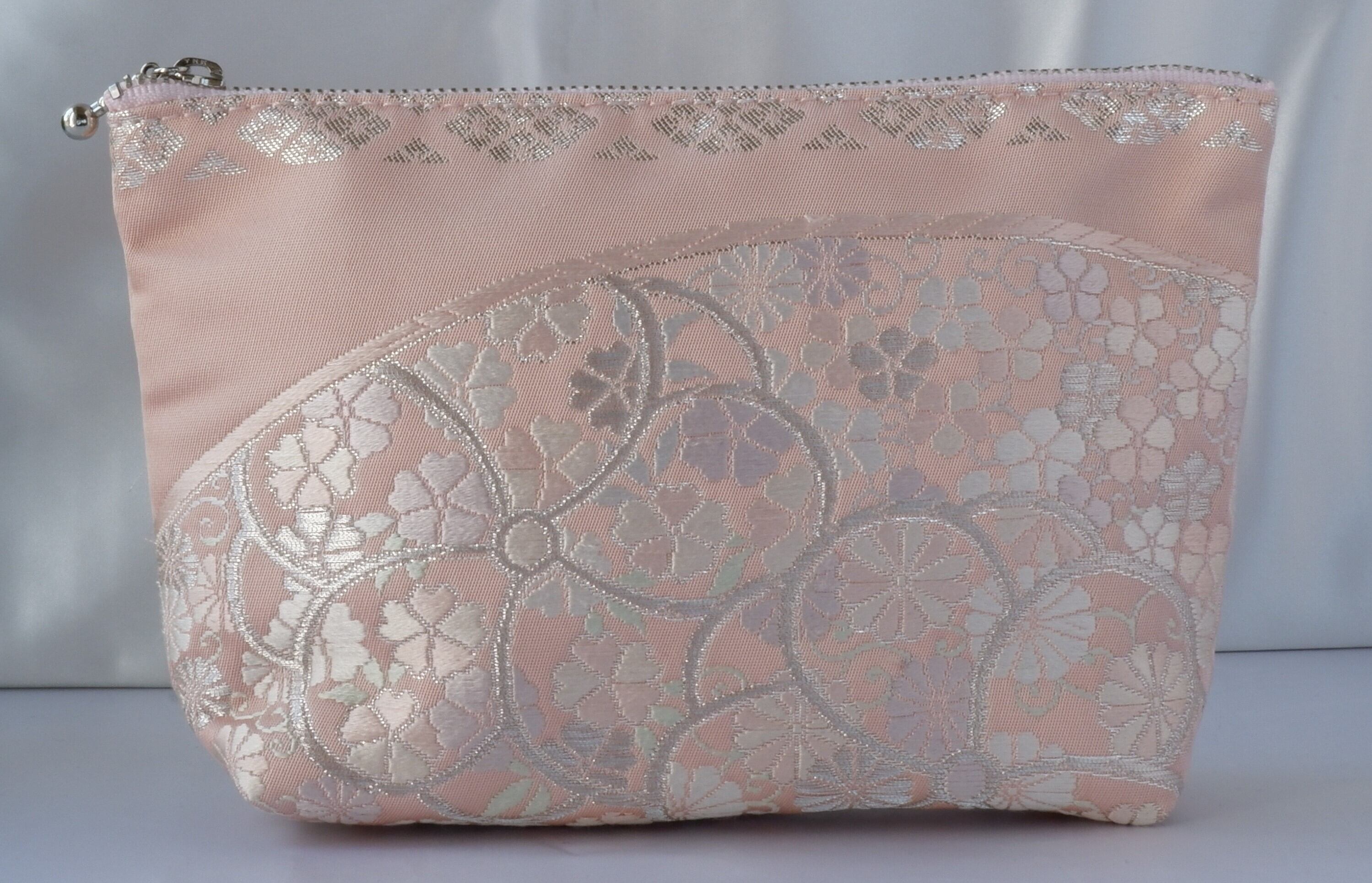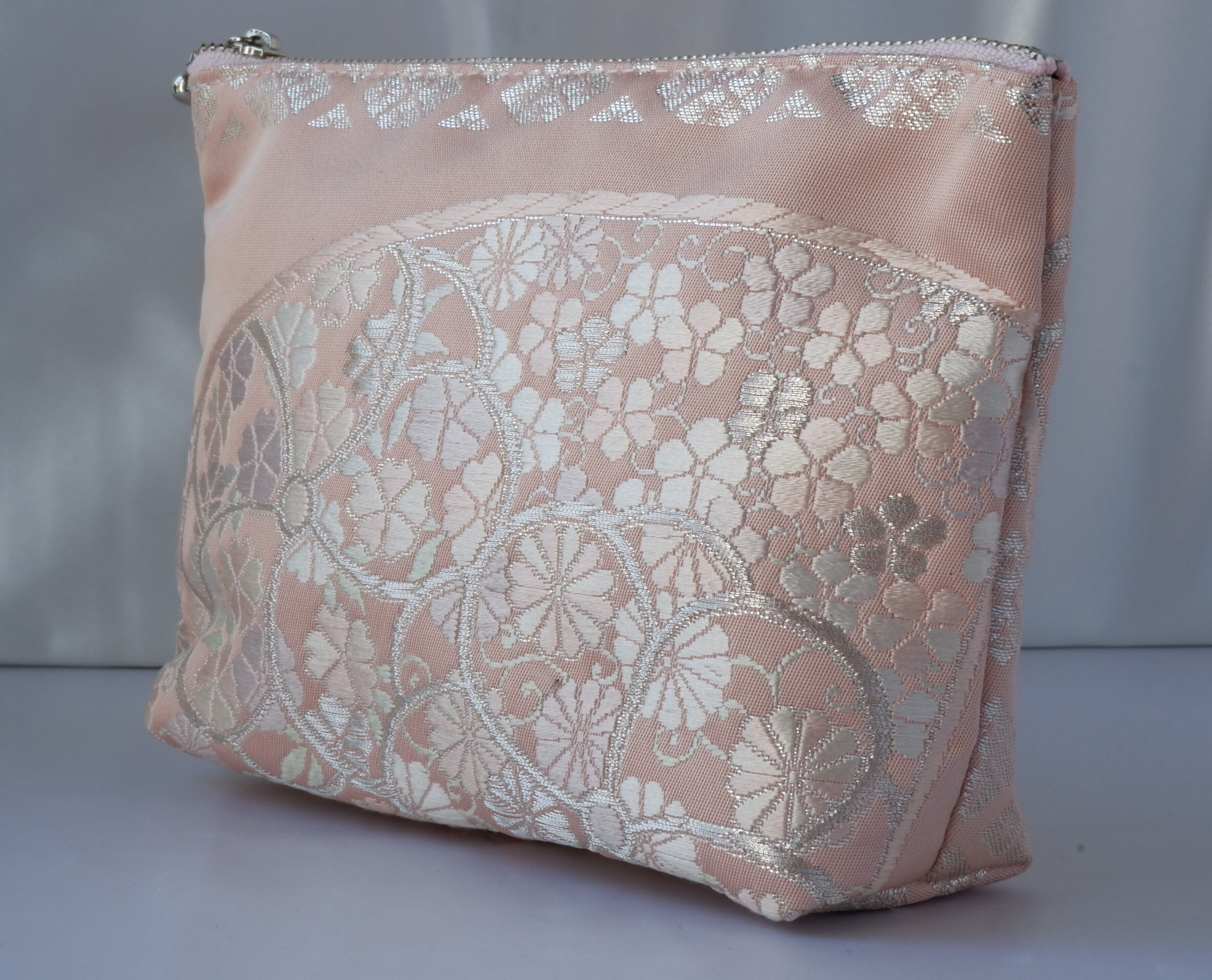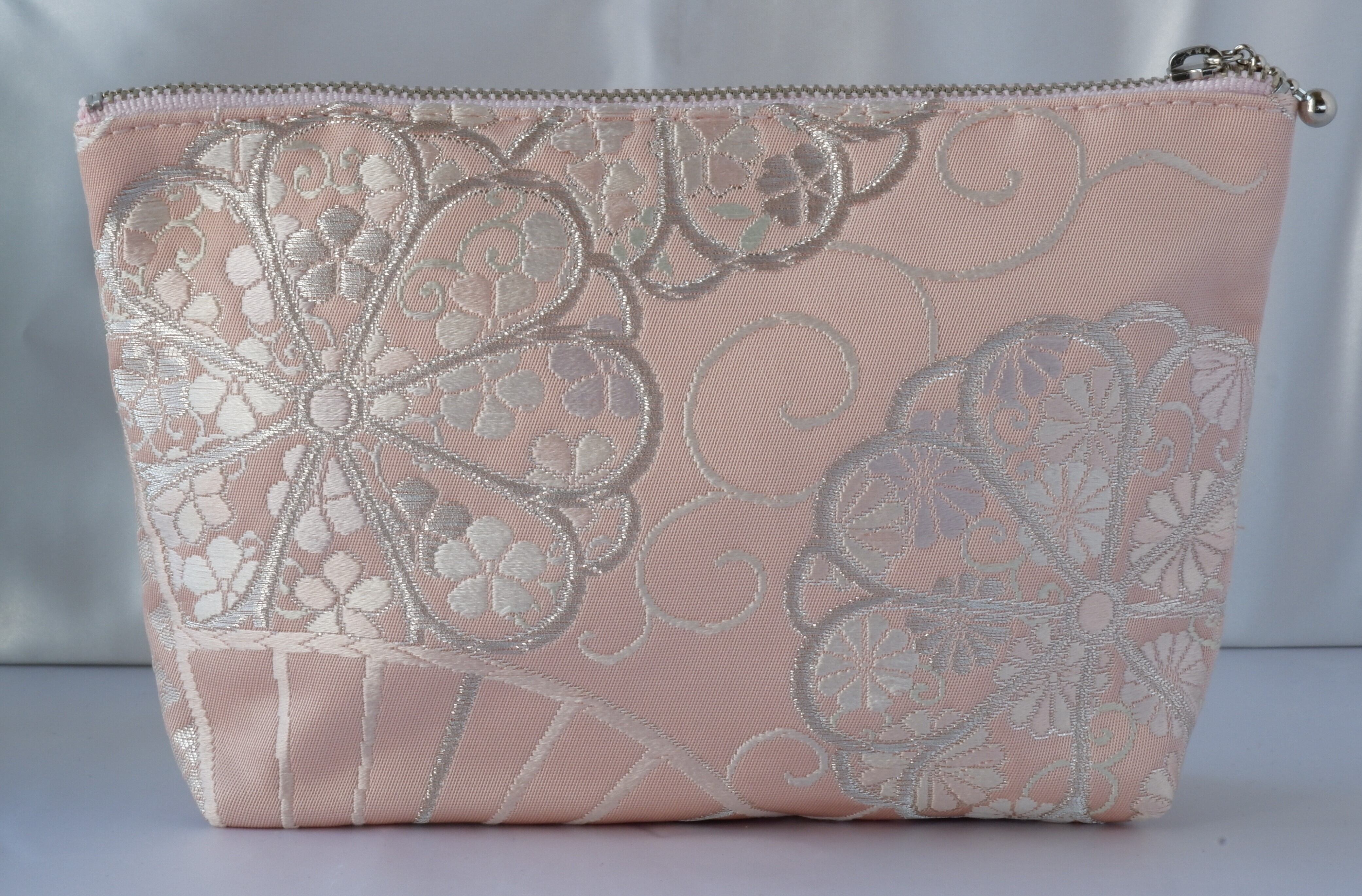 着物ポーチ ピンク 扇 菊 桜 内ポケット付 シルクの美しい光沢 着物リメイク 帯 アップサイクル