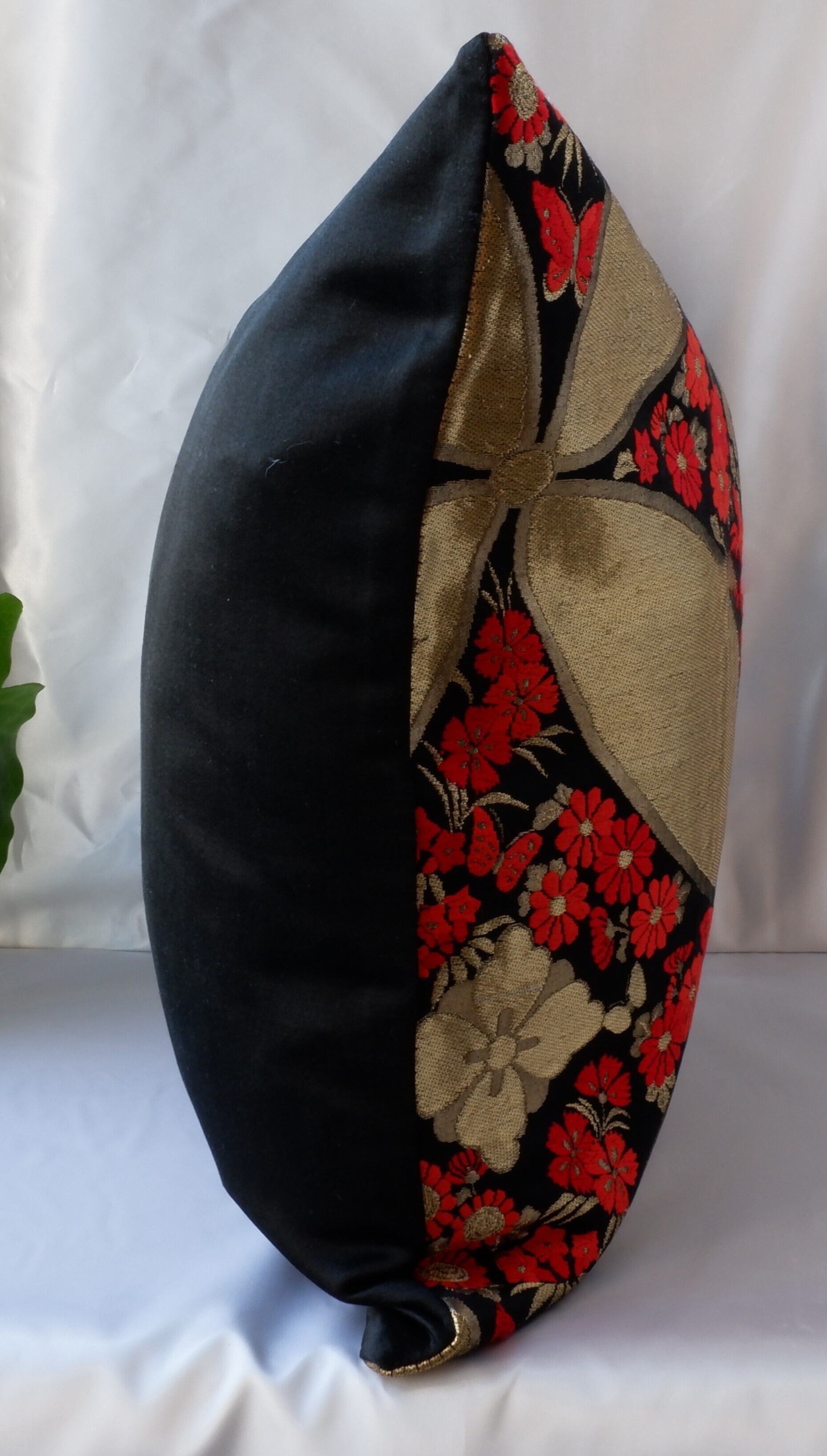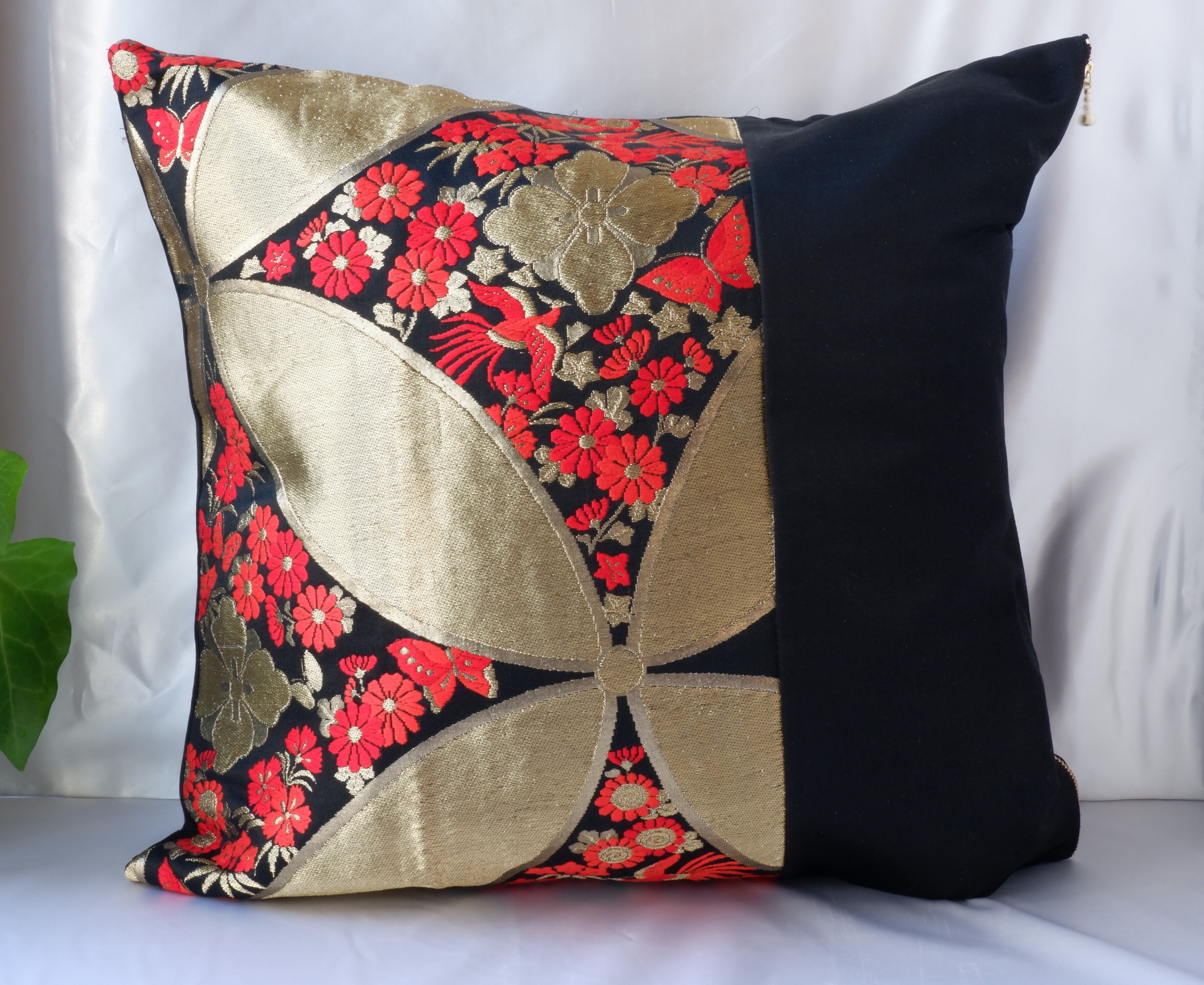 着物 クッションカバー大 黒 七宝 撫子 桔梗 尾長鳥 菊 シルクの美しい光沢 着物リメイク 帯 アップサイクル