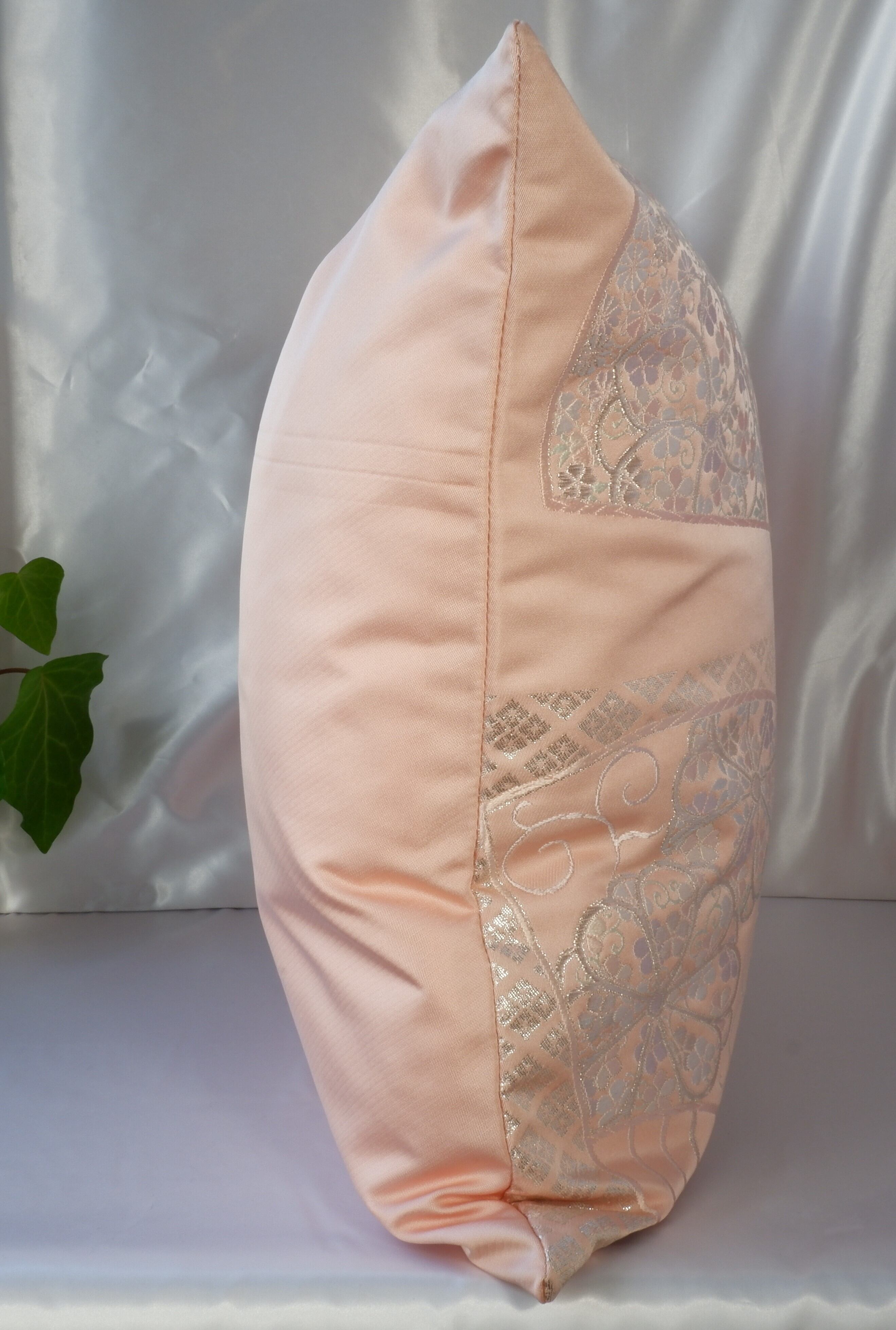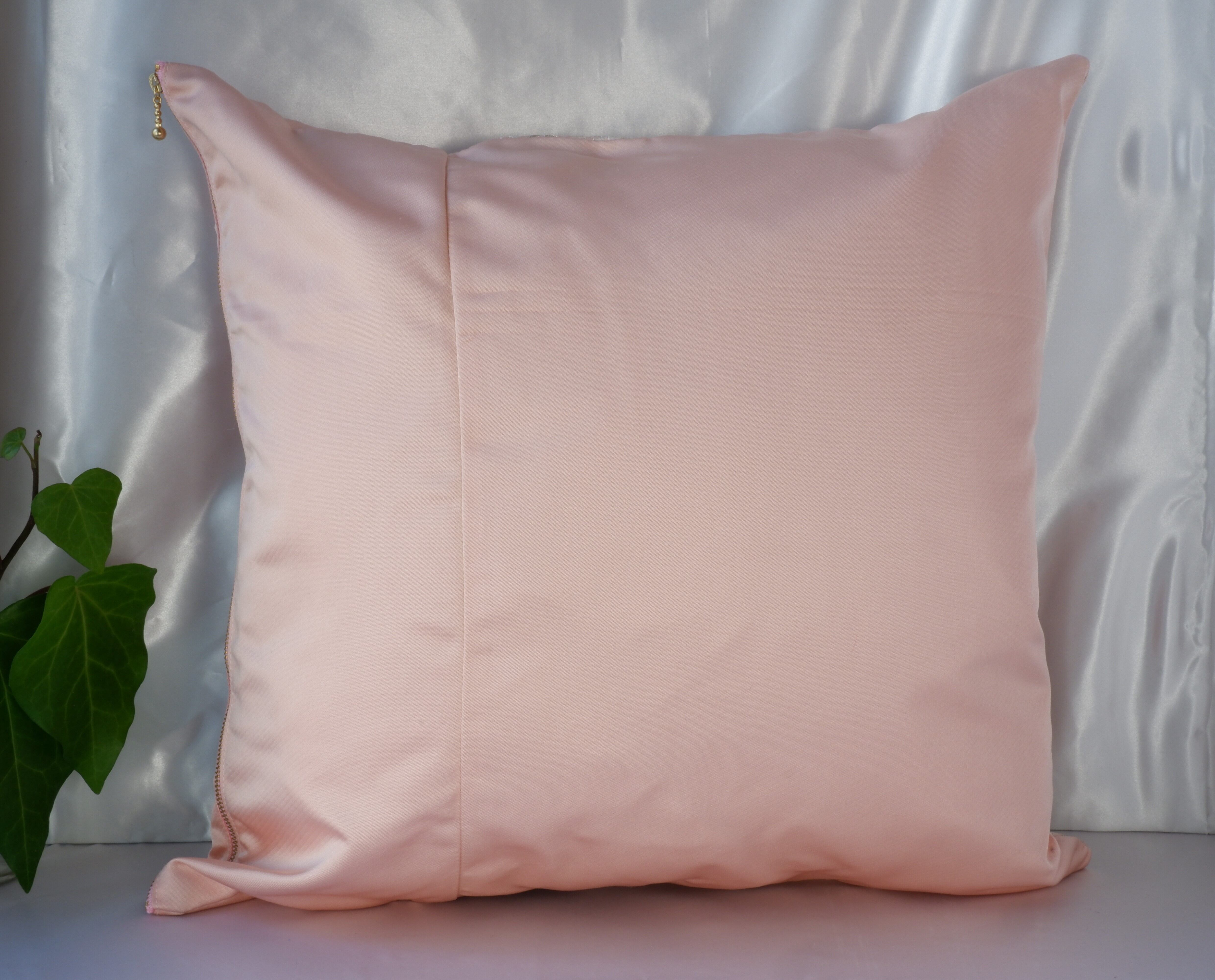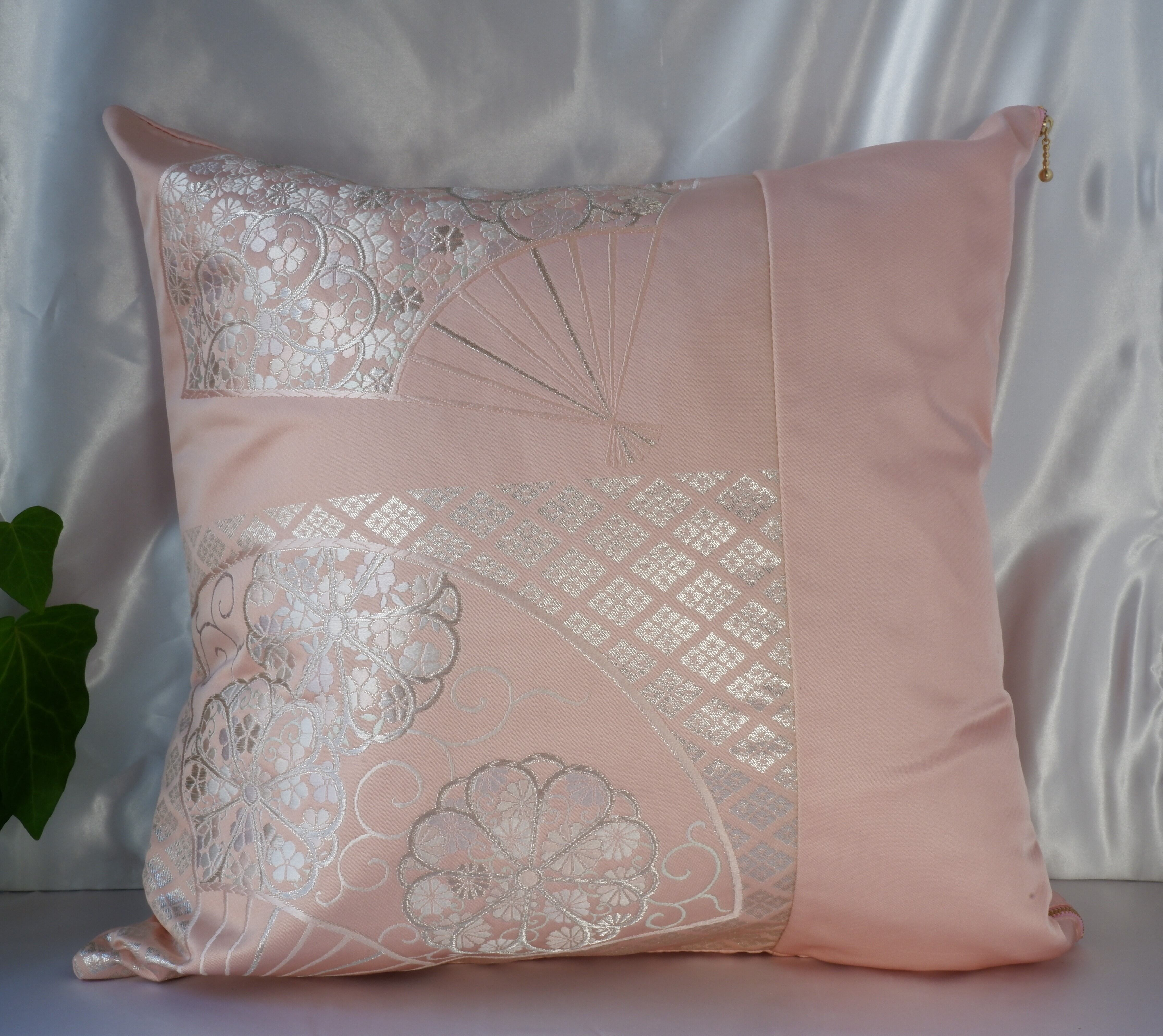 淡いピンクの生地に、大きな扇がデザインされその中には菊文様、さらにその中に細かく桜が配された、一見シンプルながらも細部までこだわり抜かれたデザイン。桜色のベースにぴったりの吉祥文様です。南からの暖気に誘われ一斉に花が咲く桜。「さくら」の”さ”は先端のことで、”くら”は神が降りる依代゛座(くら)”のことで、農事に先駆けて降臨する神が宿る木が桜と考えられていました。満開の桜に今年の豊作を願う人々の思いが託されているのが桜文様といえます。控えめな色味ながらもお部屋の雰囲気を明るくしてくれる商品といえます。帯をアップサイクルしてつくっておりますので、シルク素材で大変美しい光沢を放っています。