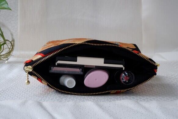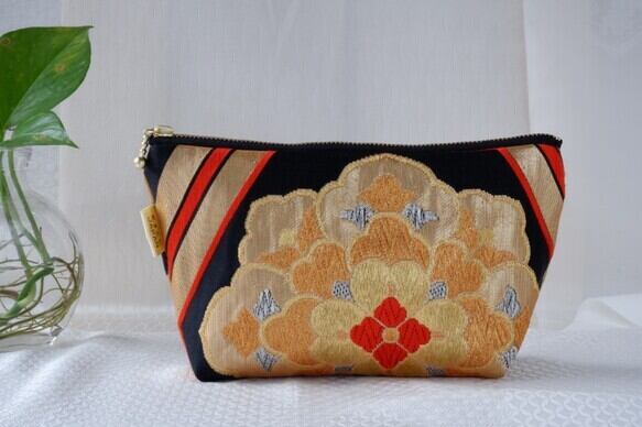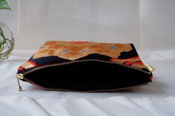 着物ポーチ 黒 唐花 金 亀甲 ポケット2カ所 シルクの美しい光沢 着物リメイク 帯 アップサイクル