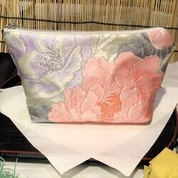 着物ポーチ 白 牡丹 絹 ポケット付き シルクの美しい光沢 着物リメイク 帯 アップサイクル