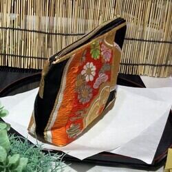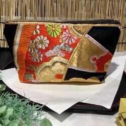 着物ポーチ 黒 金 源氏車 松 絹 ポケット付き シルクの美しい光沢 着物リメイク 帯 アップサイクル