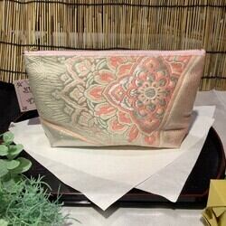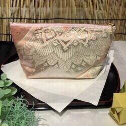 着物ポーチ ピンク 白 孔雀 羽 唐花 絹 和柄 ポケット付き シルクの美しい光沢 着物リメイク 帯 アップサイクル