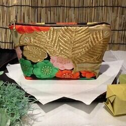 着物ポーチ 黒 牡丹 もみじ 松 和柄 日本製 ポケット付き シルクの美しい光沢 着物リメイク 帯 アップサイクル