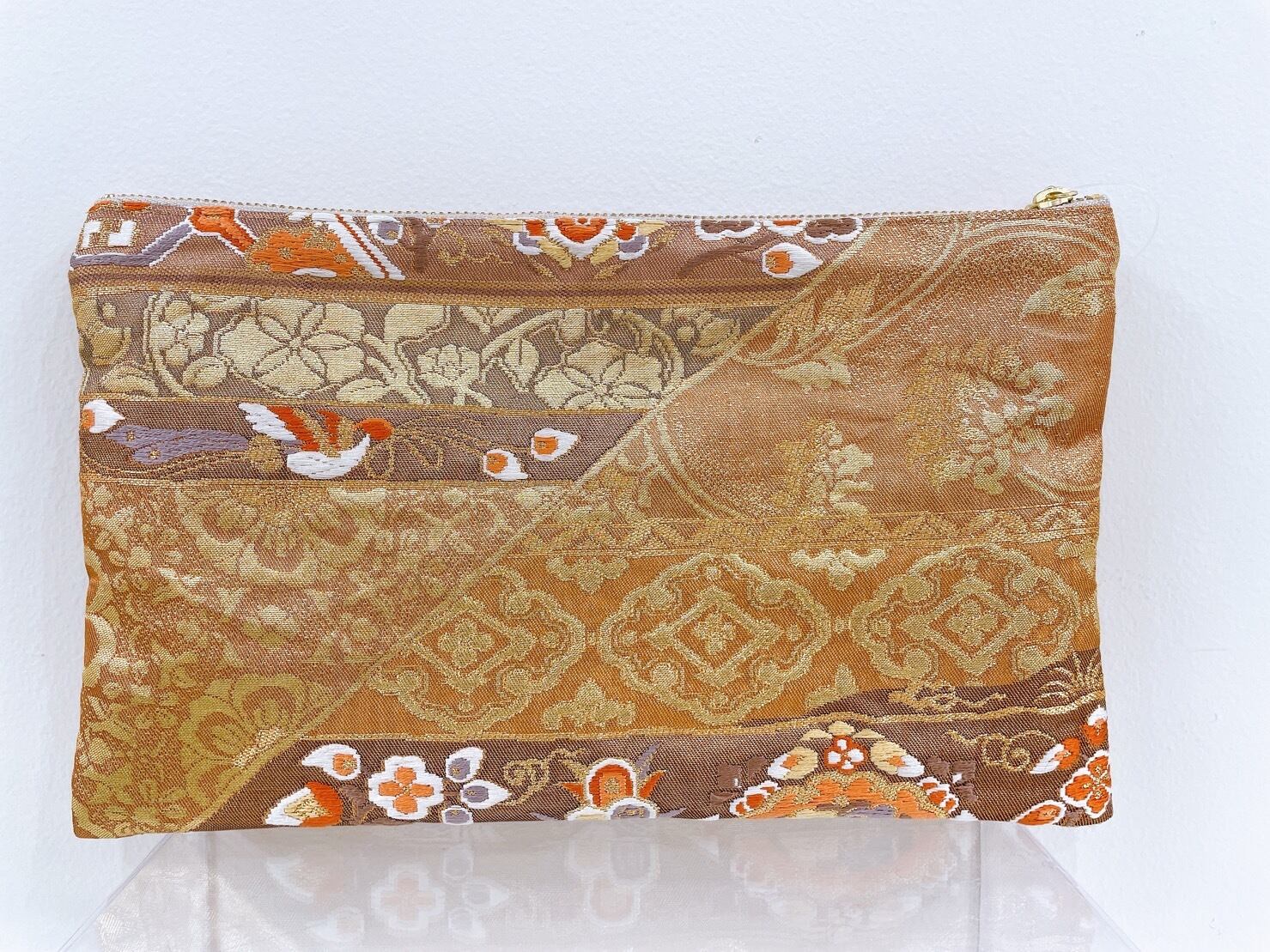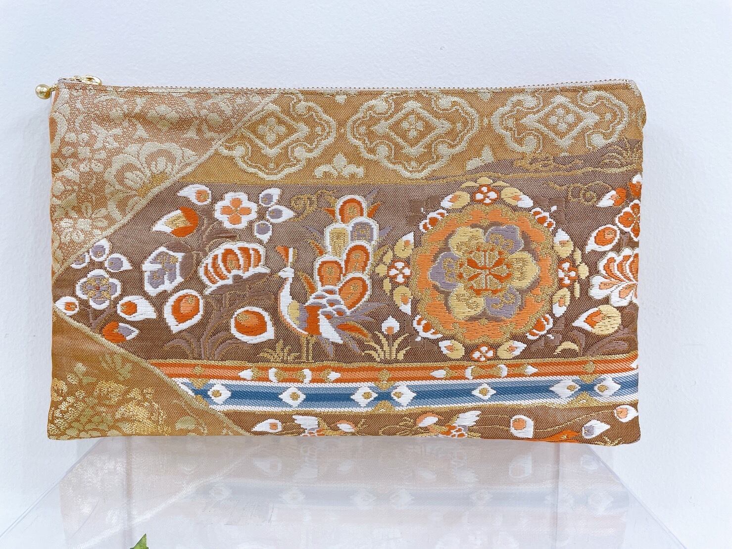 着物 御朱印帳ケース 和柄 エジプト クジャク 唐花 唐草 尾長鳥 フラットポーチ アップサイクル 帯 シルク 25㎝