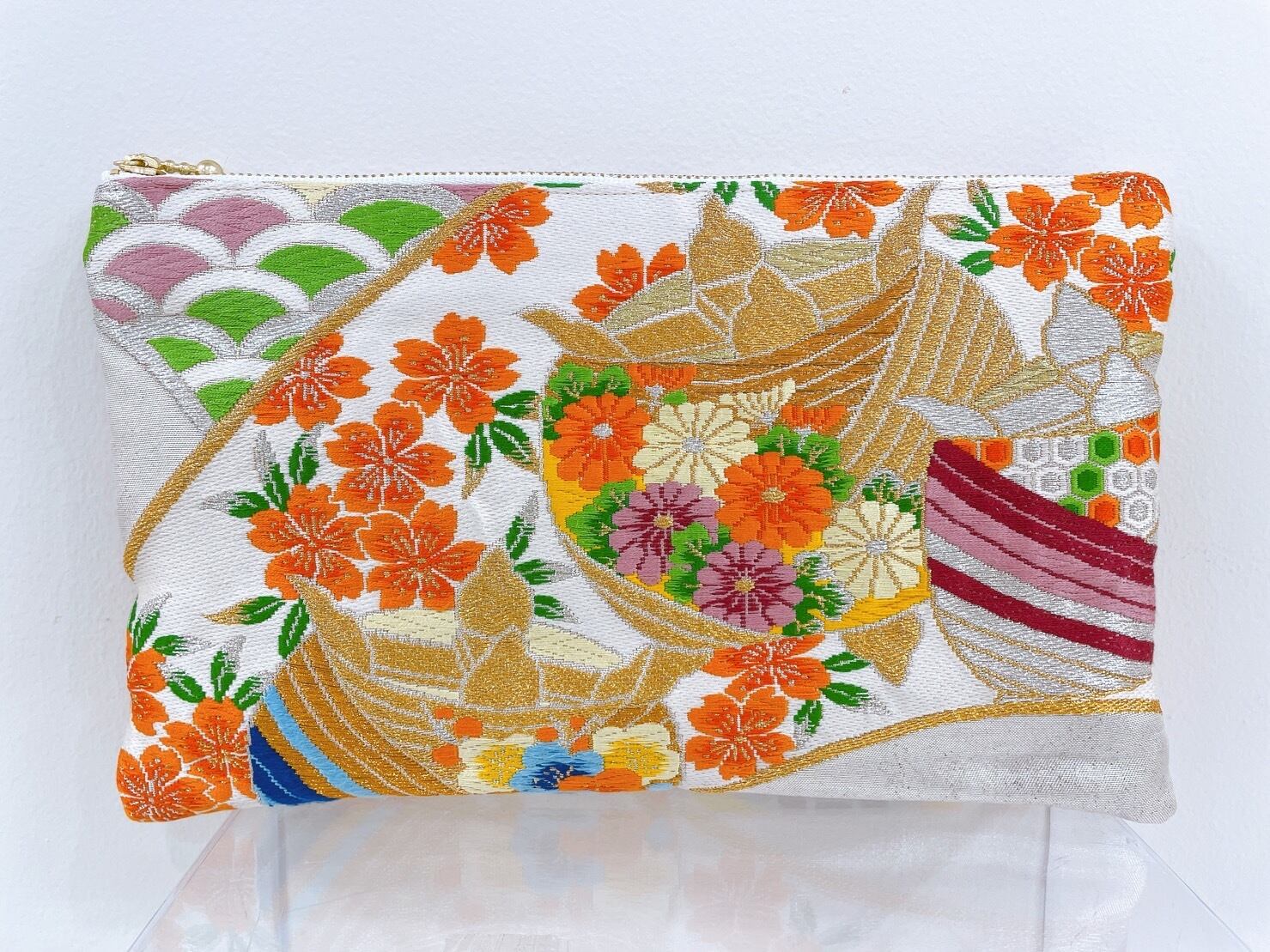 着物 御朱印帳ケース 和柄 白 糸巻 青海波 桜 梅 亀甲 菊 唐花 フラットポーチ アップサイクル 帯 シルク 25㎝
