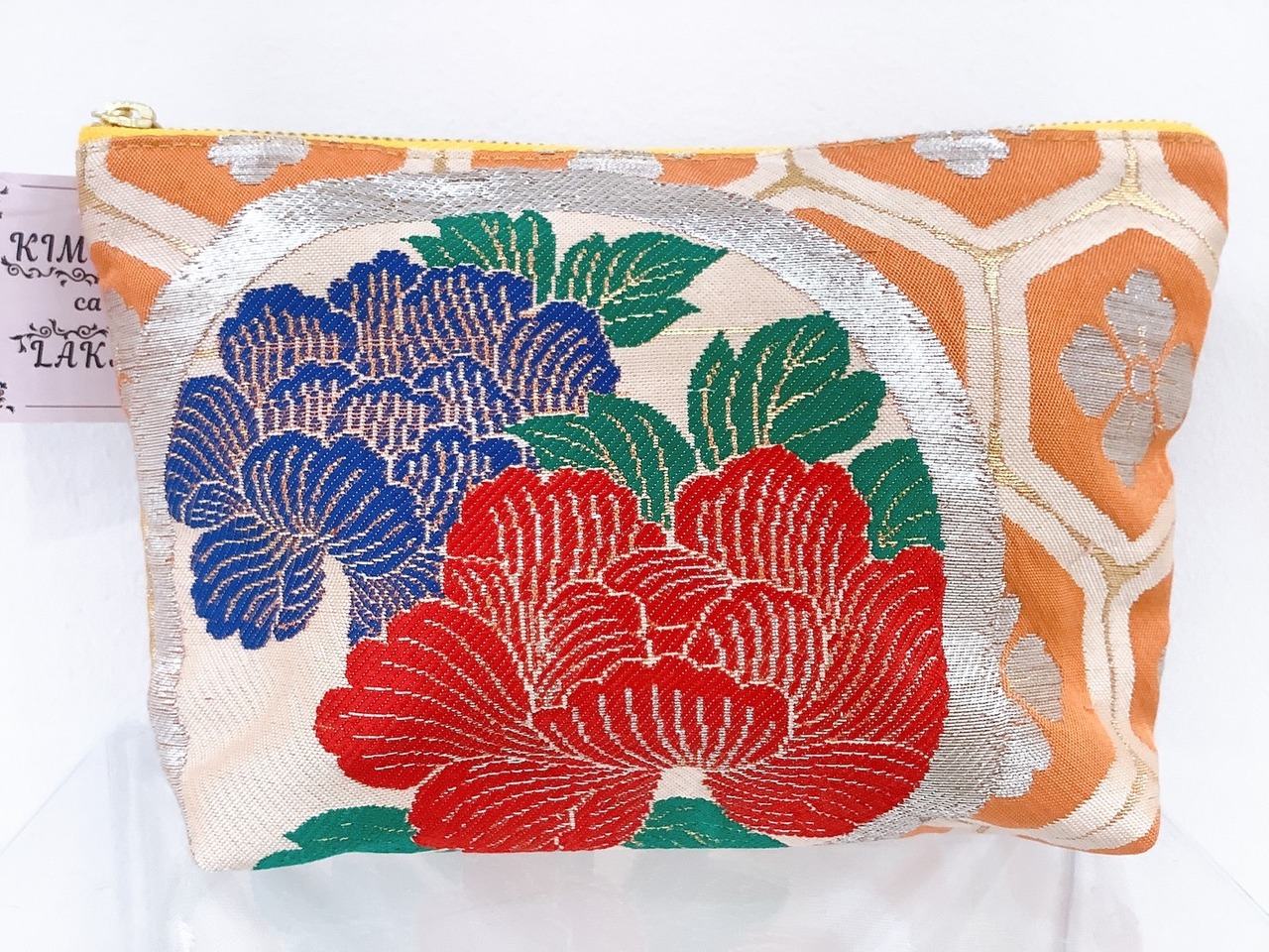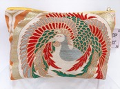 着物ポーチ 金 鳳凰 牡丹 フェニックス 不死鳥 ポケット付き シルクの美しい光沢 着物リメイク 帯 アップサイクル