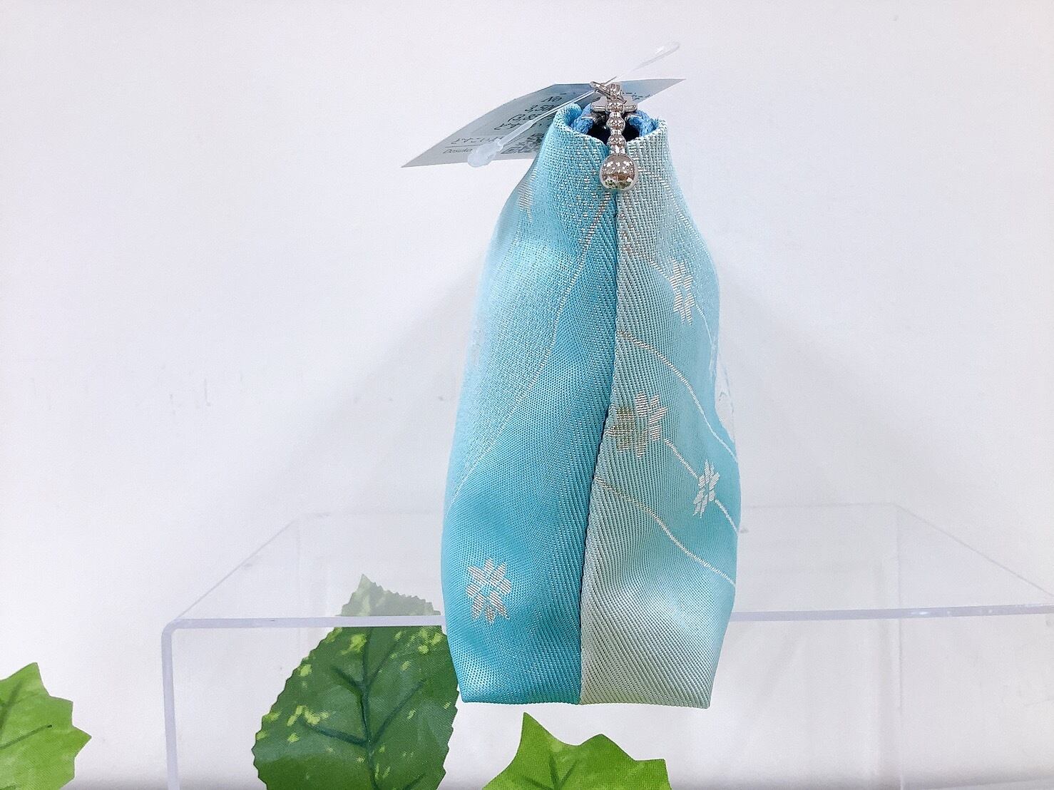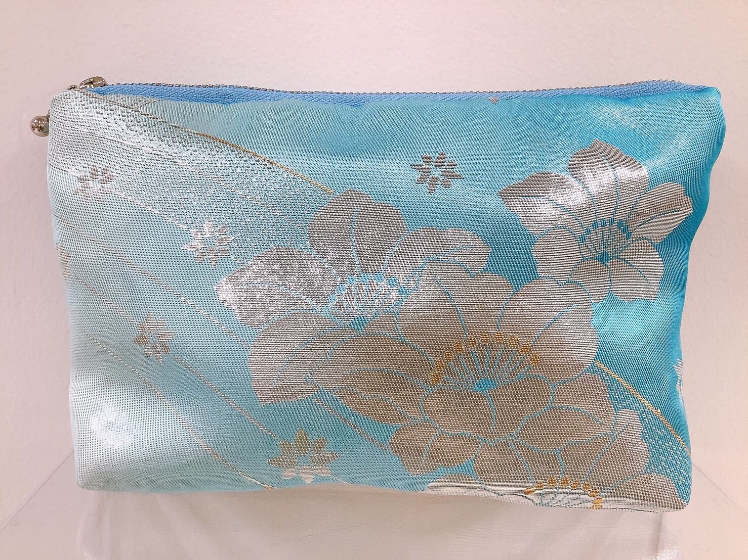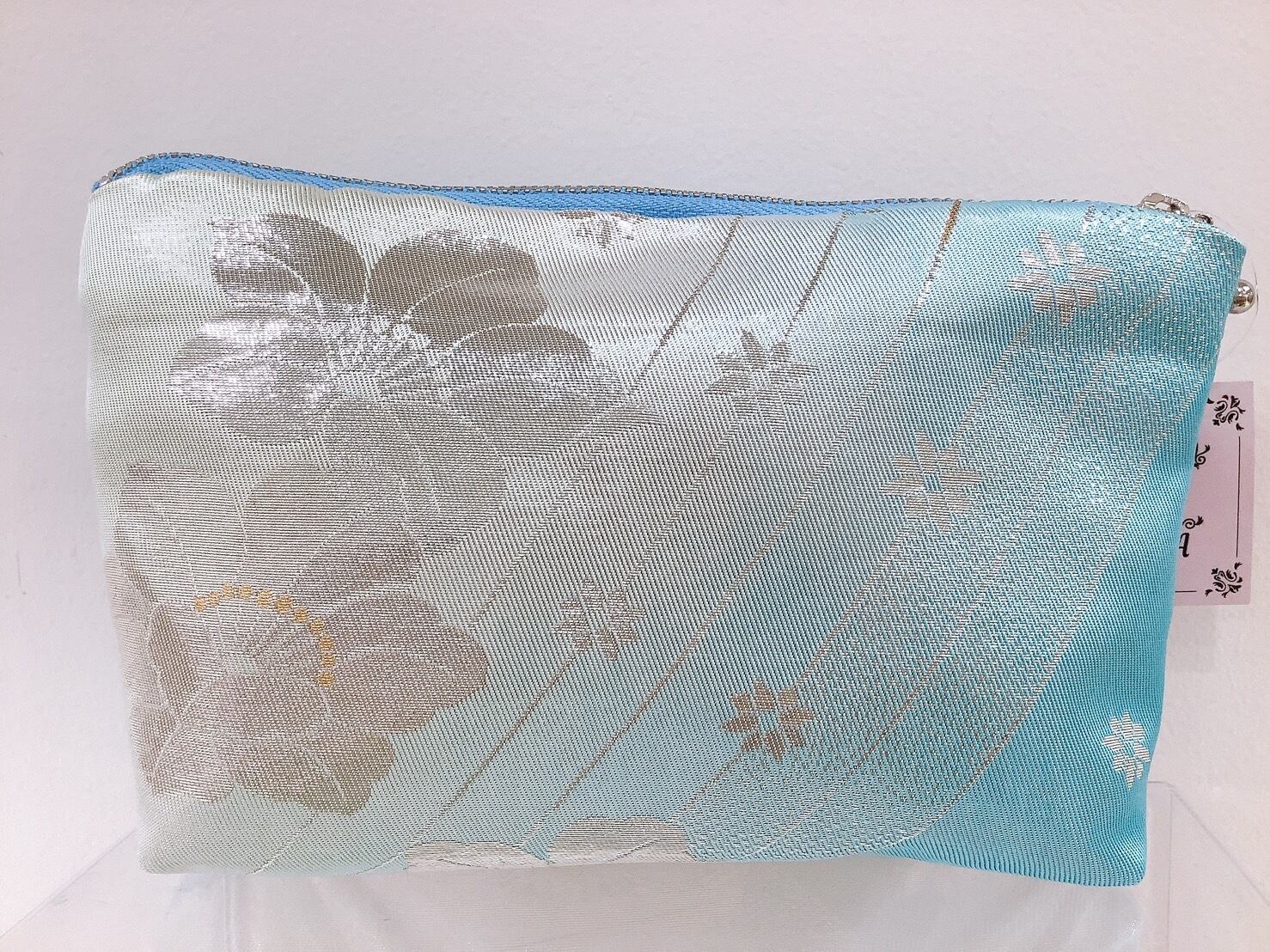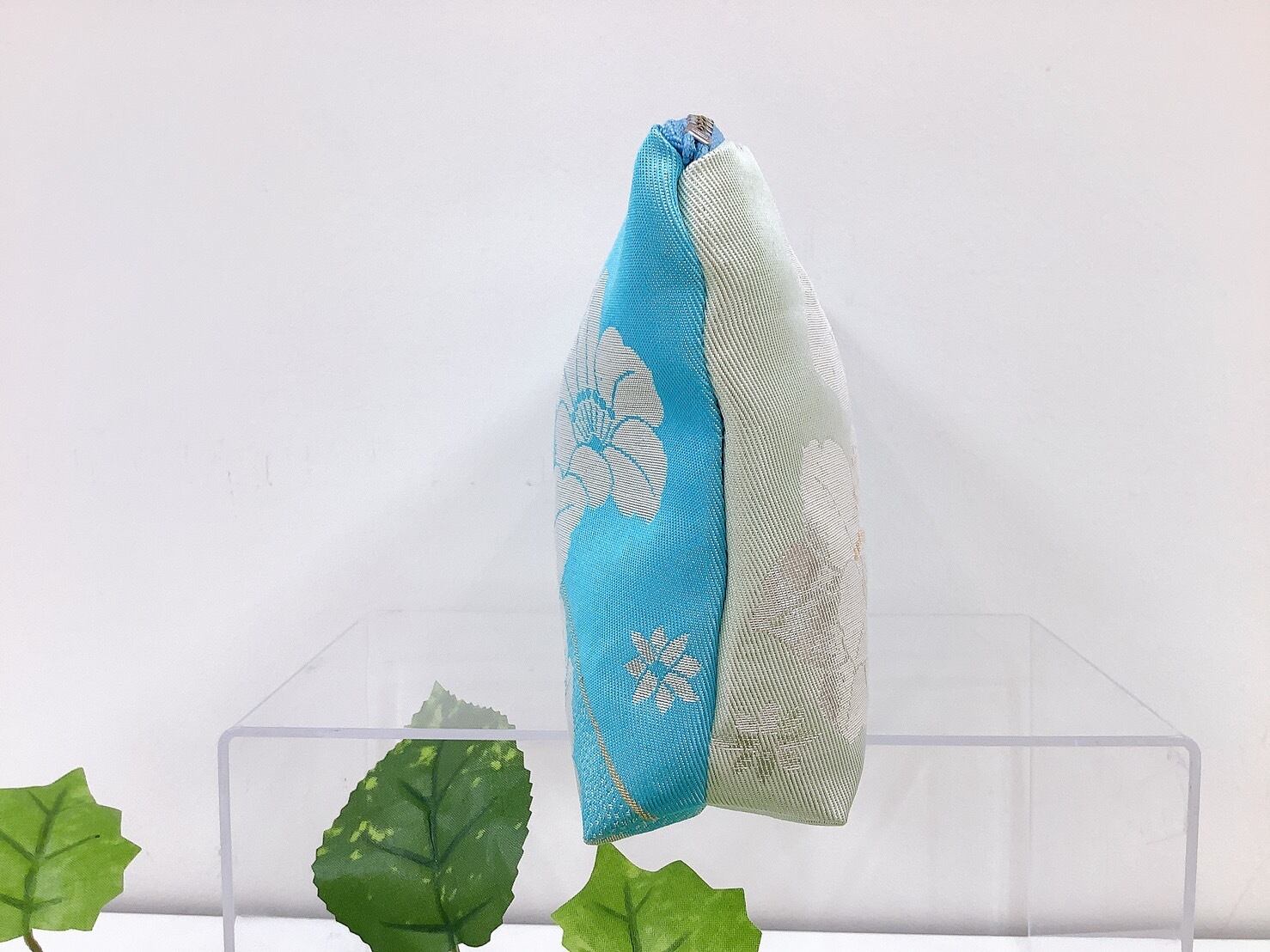 着物ポーチ 水色 グラデーション 花 ポケット付き シルクの美しい光沢 着物リメイク 帯 アップサイクル