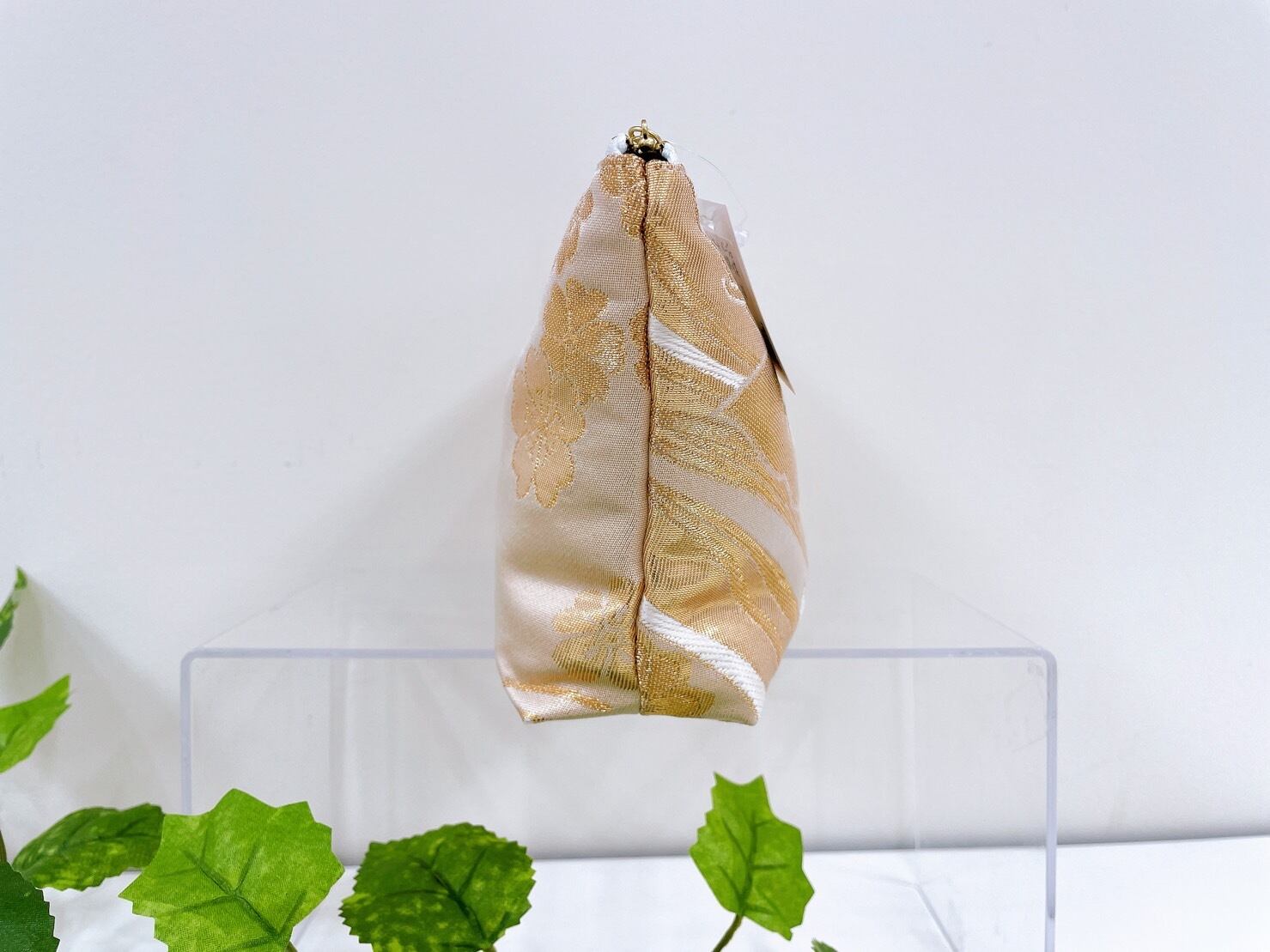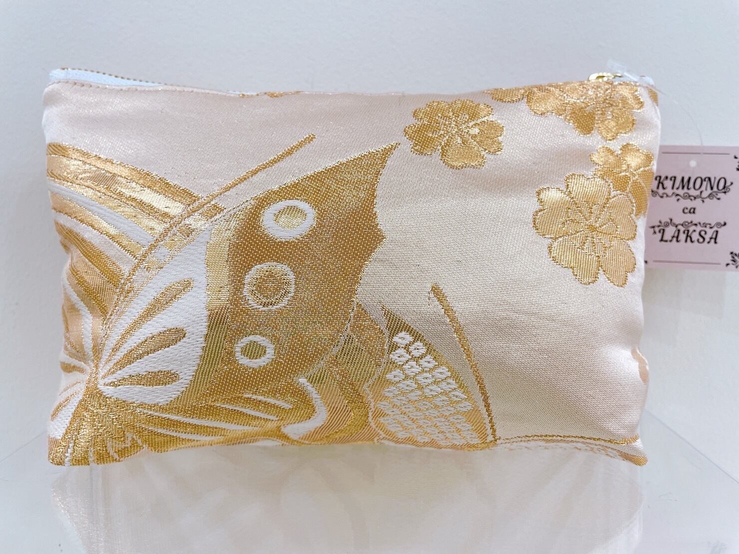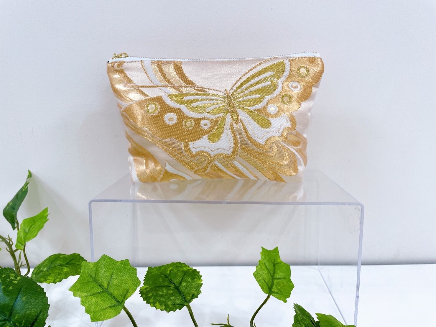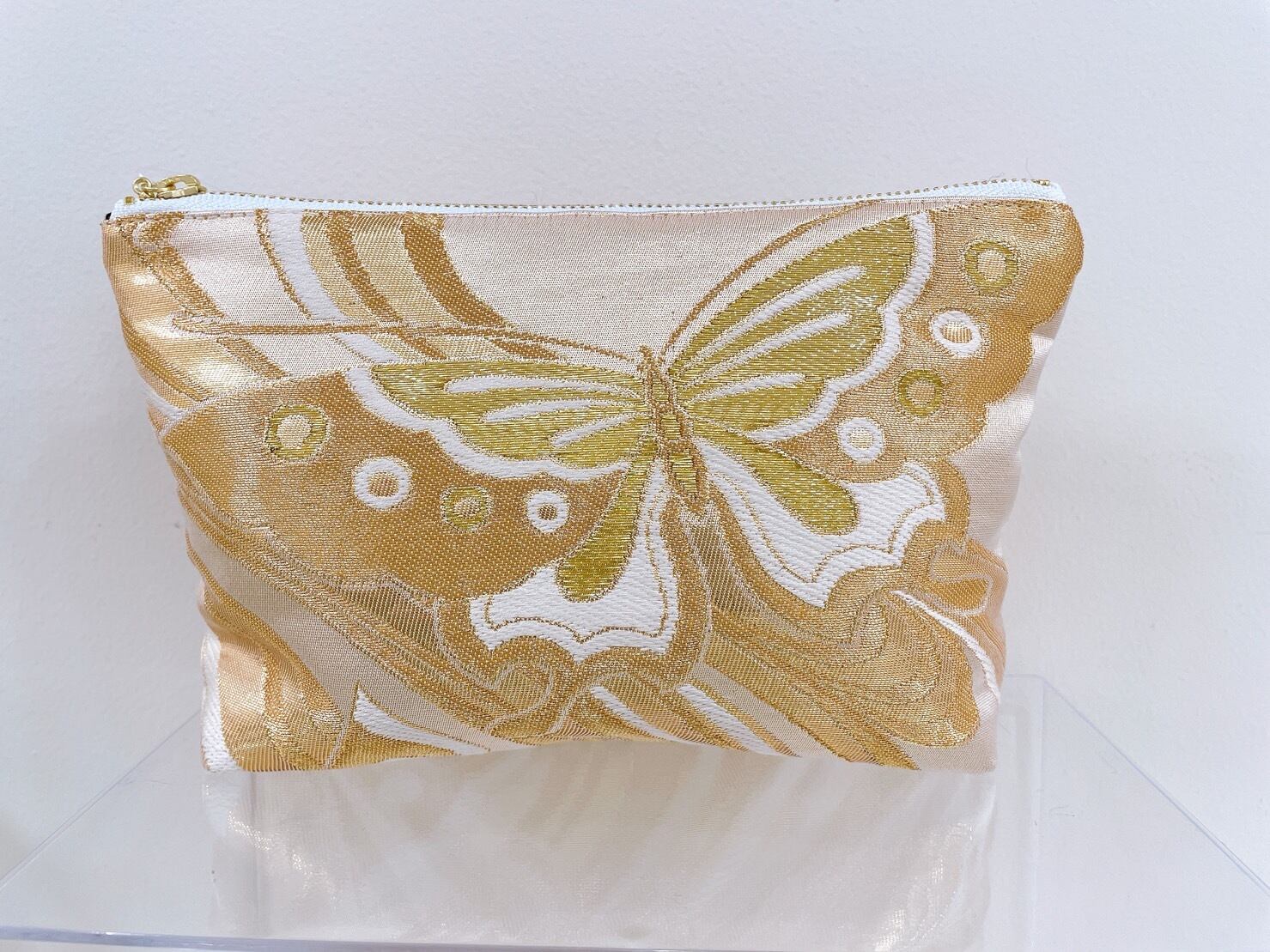 着物ポーチ 金 蝶 ポケット付き シルクの美しい光沢 着物リメイク 帯 アップサイクル