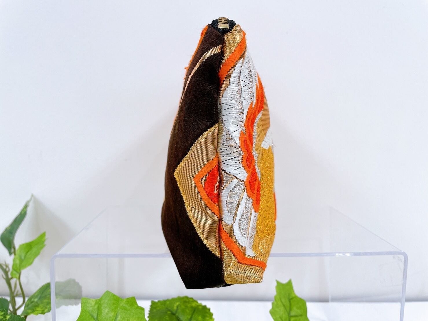 リユースの帯をアップサイクルして作っております。1点1点国内で職人の手により丁寧に縫製されております。細心の注意を払ってはおりますが、傷、糸の飛び出し、汚れなどがある可能性もございます。アップサイクル品故の特殊性でございますのであらかじめご了承の上お買い上げください。着るための着物を形を変えて、元の持ち主から新しい持主へ、新しい用途で使っていただけるようにお届けできることを喜びとしております。何卒ご理解の上、アップサイクル品ならではの商品をお楽しみください。ノークレームノーリターンでお願いいたします。