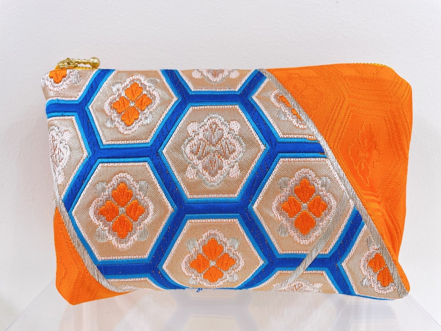 オレンジをベースにくっきりした青で亀甲文様が描かれ中は唐花文様がデザインされています。オレンジに青という珍しい組み合わせでがモダンな印象を与えますね。亀甲はカメの甲羅を模した文様で、鶴は千年、亀は万年の言葉通り、持ち主の長寿や健康を祈る文様です。