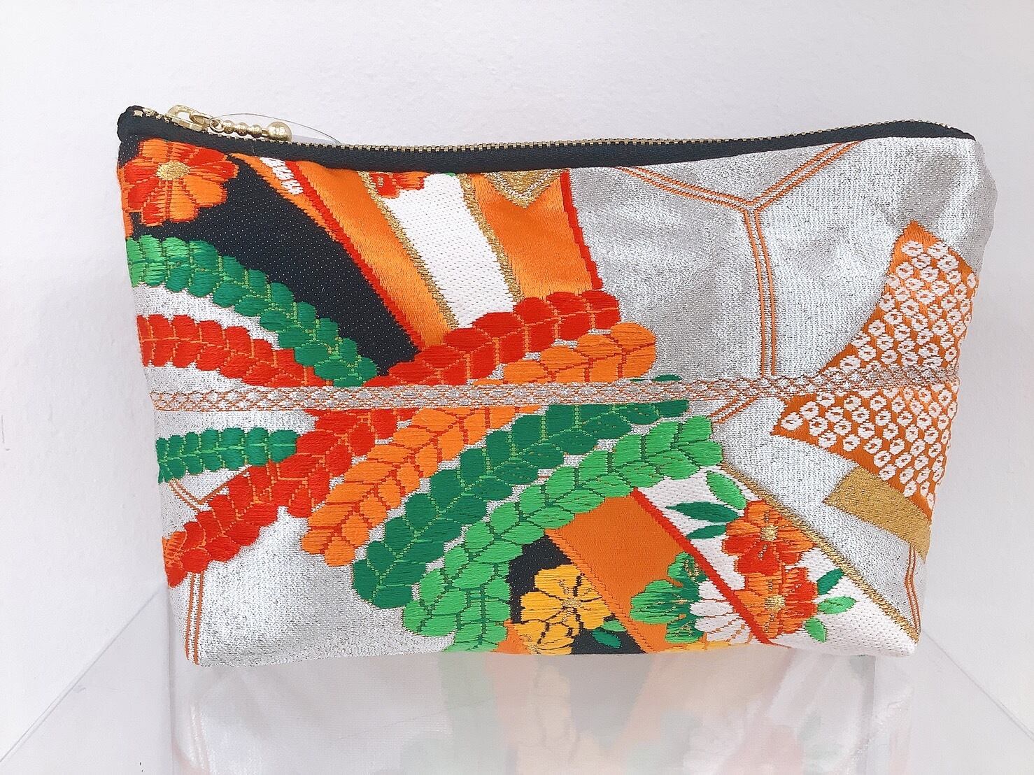 着物ポーチ 黒 オレンジ 組紐 ポケット付き シルクの美しい光沢 着物リメイク 帯 アップサイクル
