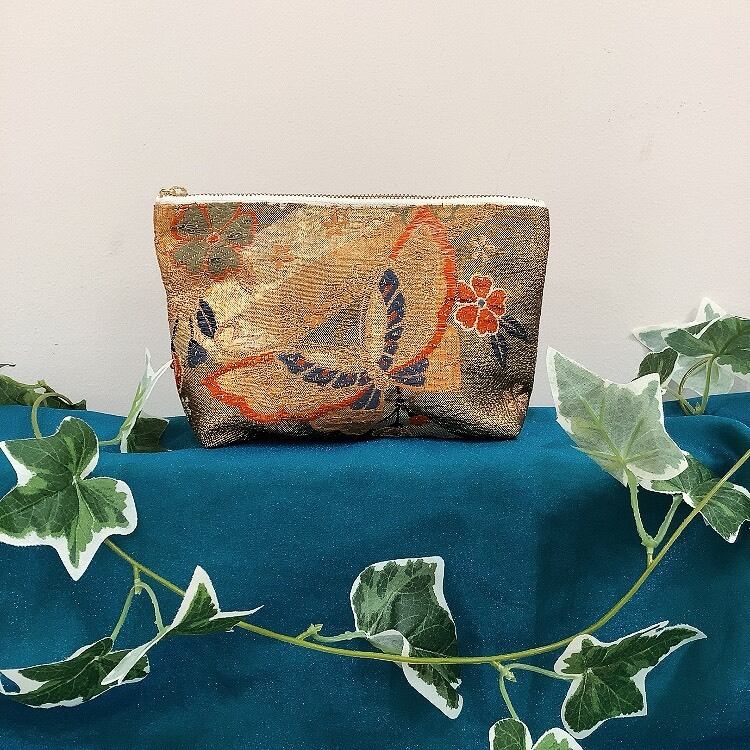 内側にポケットがあり、真ん中で仕切り付きで、コンパクトやリップなど様々なものを機能的に収納可能です。ひらひらと飛び回るさまがいかにも可憐に見える蝶ですが、意外にも「立身出世」の意味があります。蝶の天高く昇っていく様が人生の高みを上ってゆく姿、不死不滅の象徴とあがめられてきました。蝶の文様は戦国武将たちが好んで身に着け、平家の代表紋としても知られています。