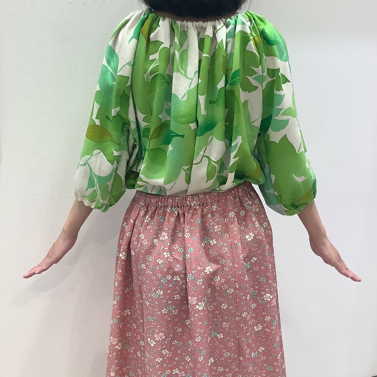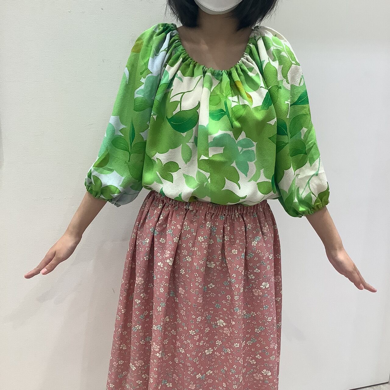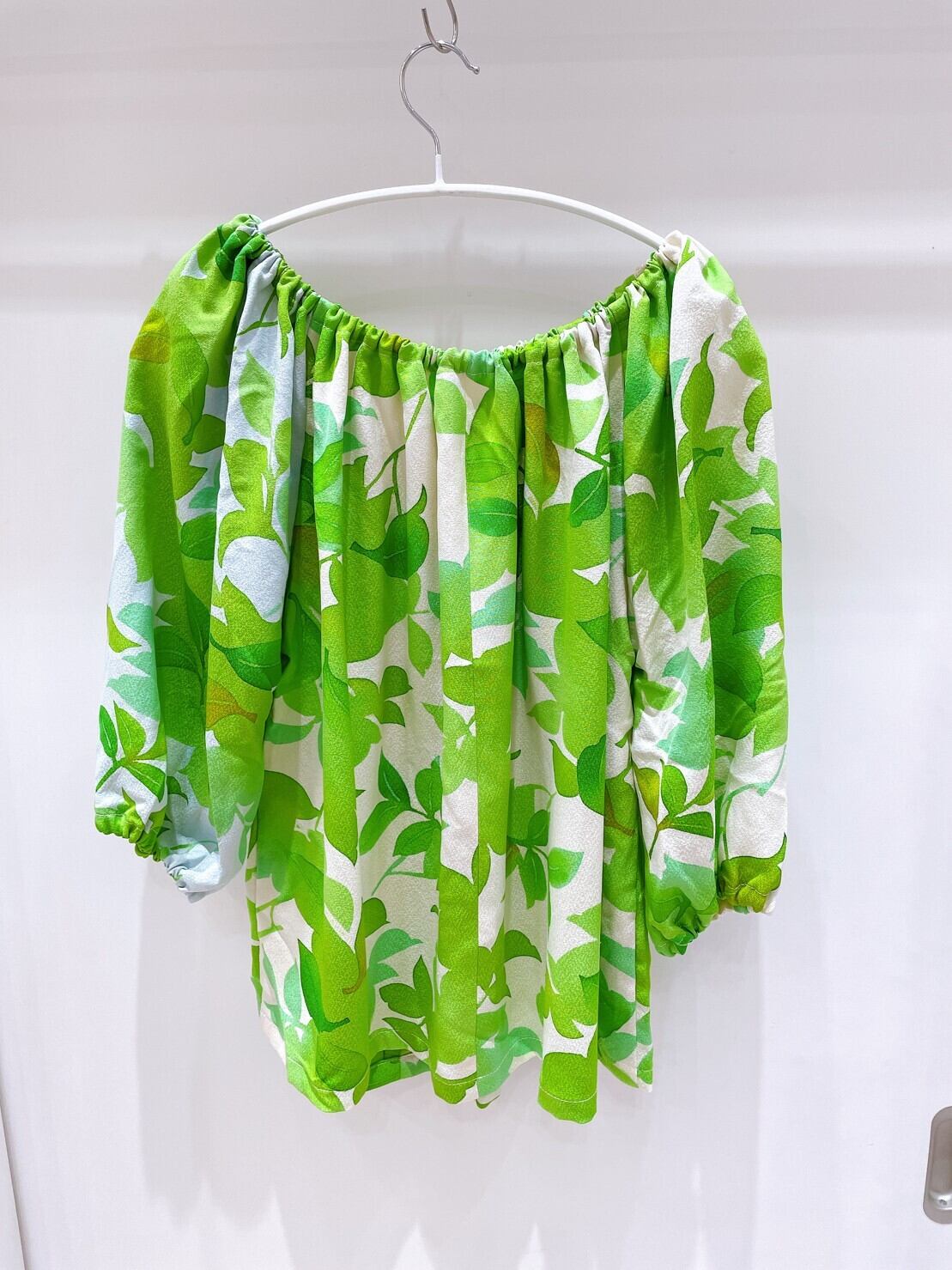 瑞々しい若葉の柄の着物から作られており、着るだけで気分もすがすがしくなる逸品です。本物の着物をアップサイクルしてつくっておりますので、シルク素材で大変美しい光沢を放っています。サイズはフリーサイズのチュニックタイプ。すべすべの手触りがとても気持ちいいです。