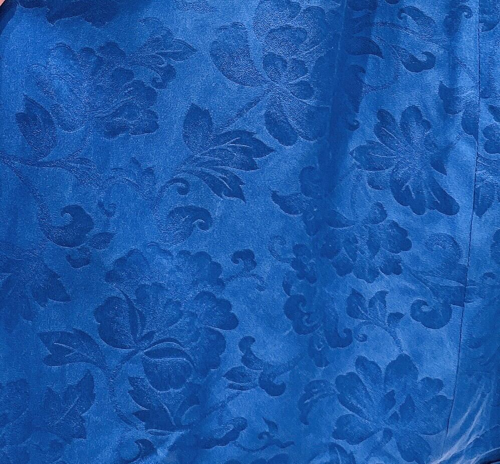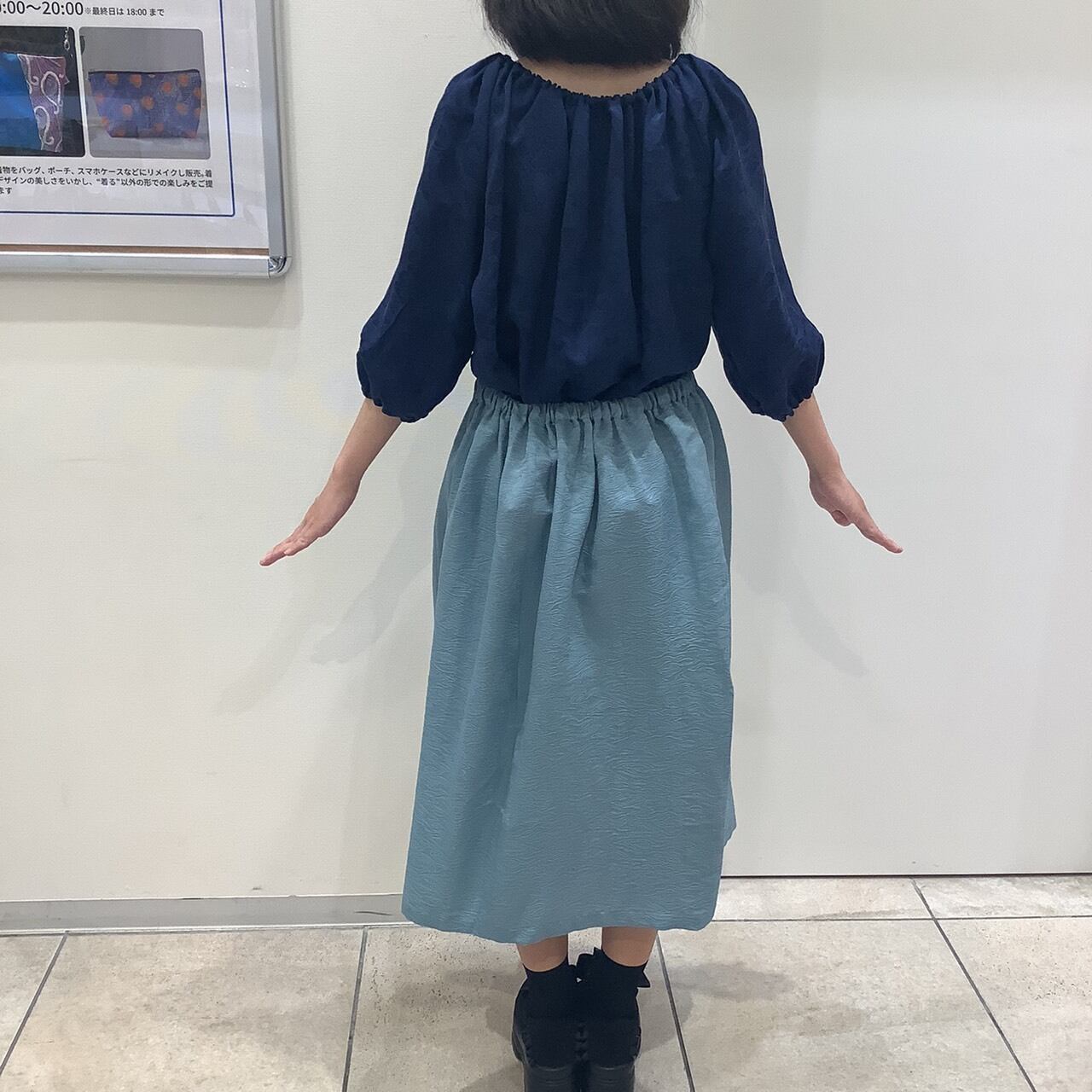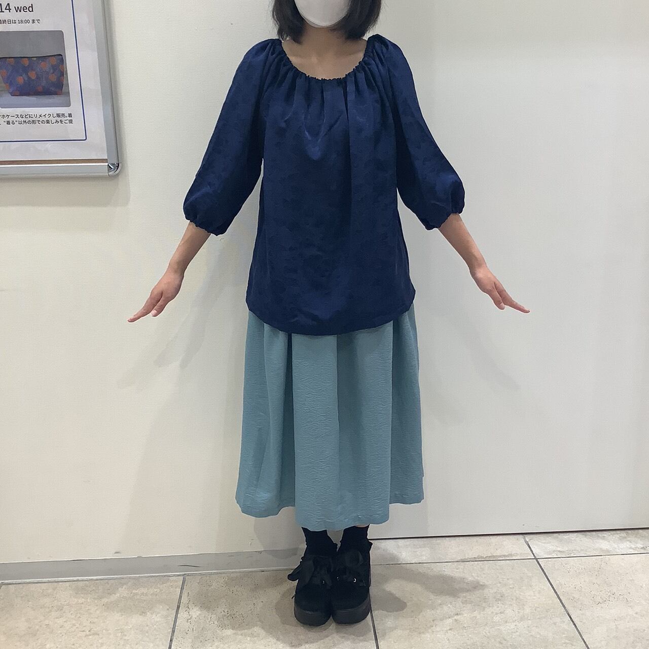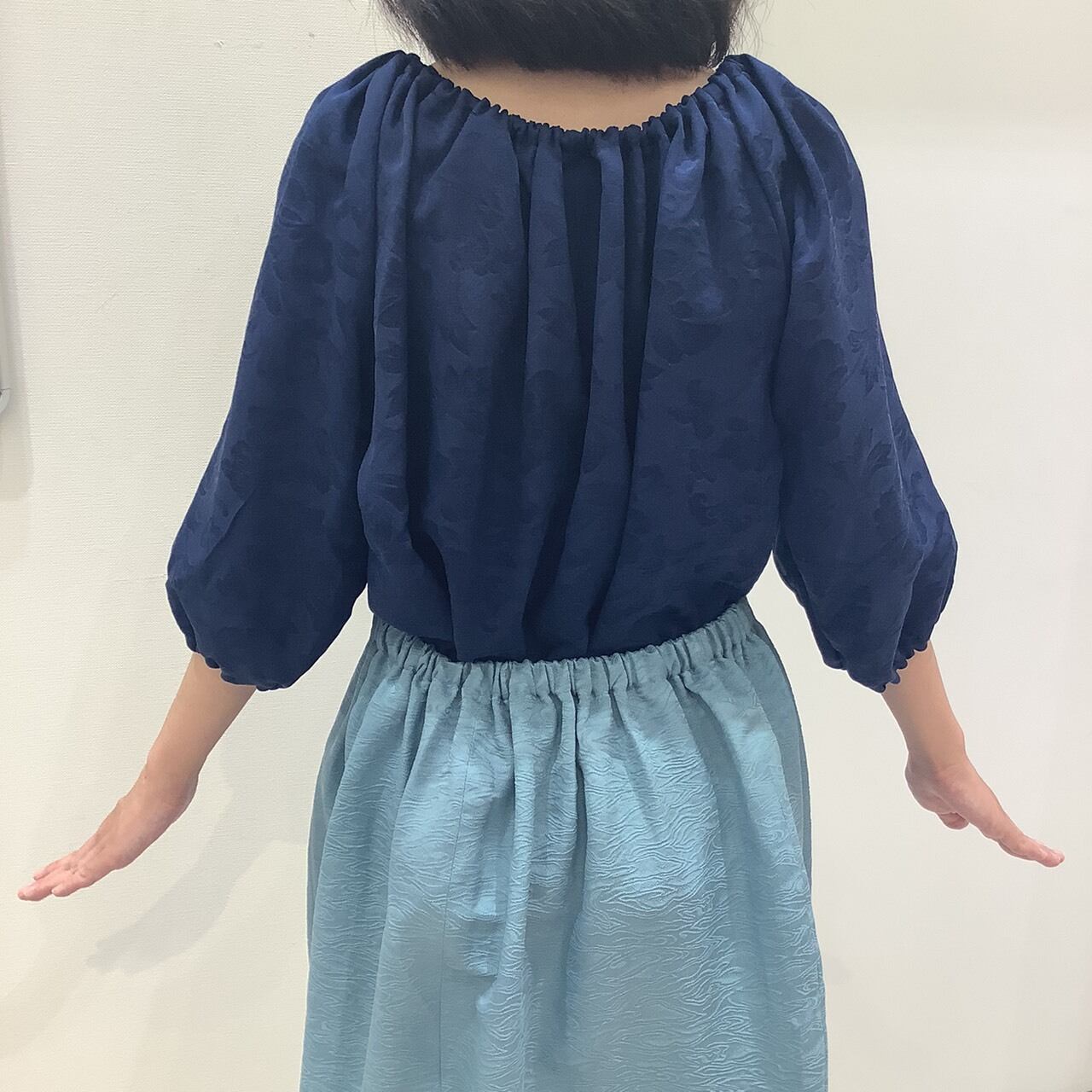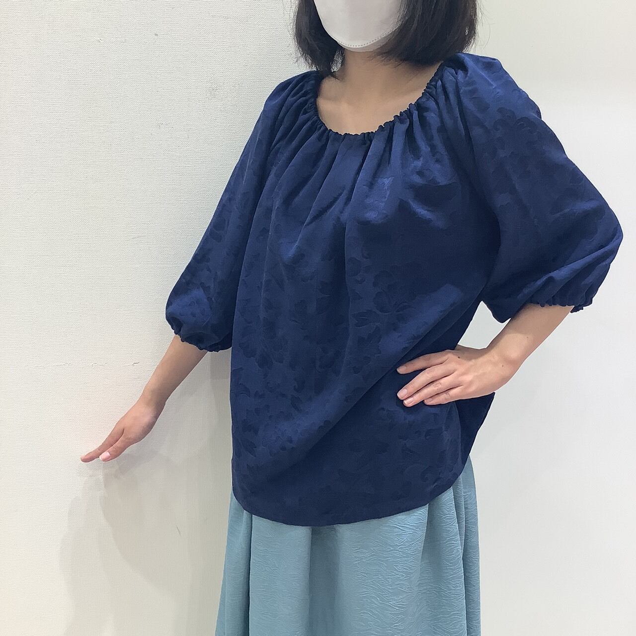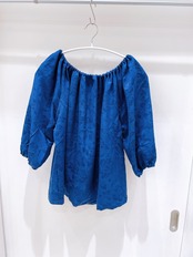 一見地味な紺ながら、地紋に幾重にも牡丹が織り出され、じっくり見るととっても高級感のある逸品。まるでビロードのような見た目です。本物の着物をアップサイクルしてつくっておりますので、シルク素材で大変美しい光沢を放っています。サイズはフリーサイズのチュニックタイプ。すべすべの手触りがとても気持ちいいです。