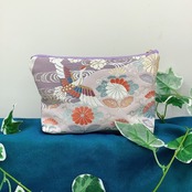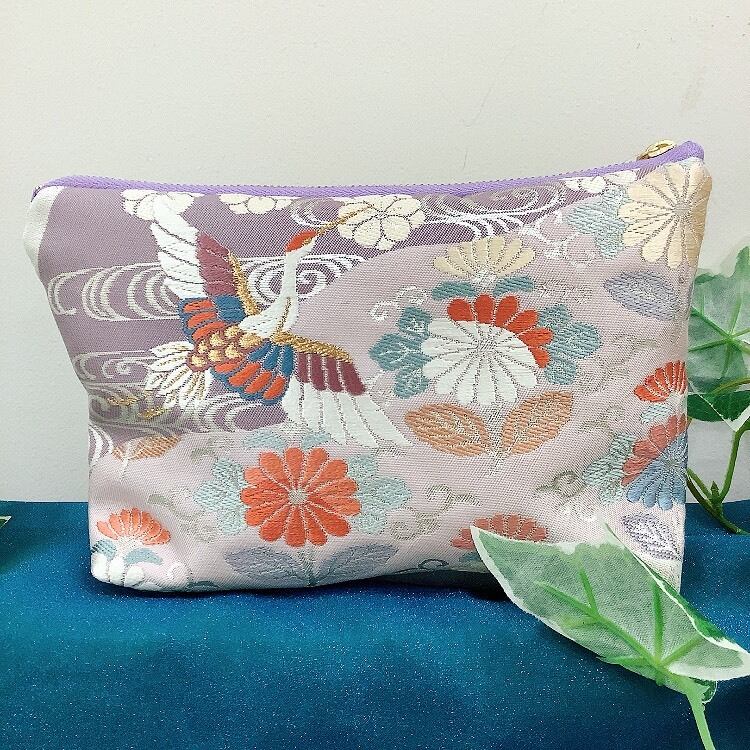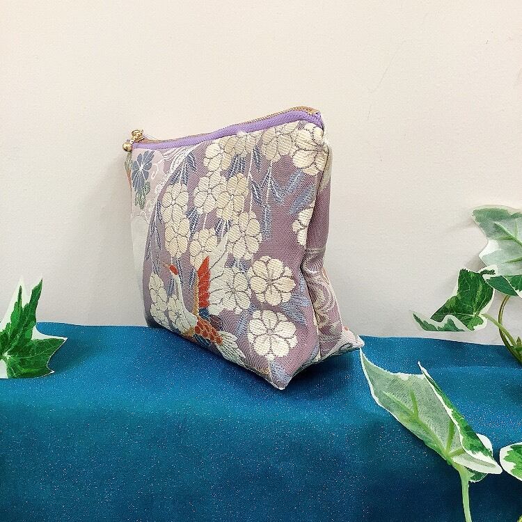 着物ポーチ 紫 鶴 菊 枝垂桜 花 ポケット付き シルクの美しい光沢 着物リメイク 帯 アップサイクル
